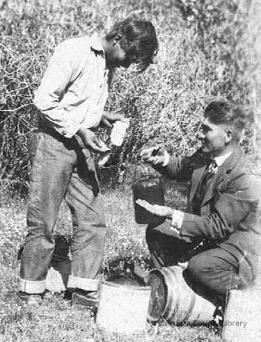 John Neal, Chukchansi Yokuts, is shown here with an unidentified man making alcohol during Prohibition.Photograph Details