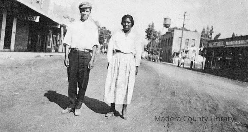 This photo was included in a photo collection that belonged to Harry Jones, a Chukchansi Yokuts Indian. This couple has remained unidentified and further research on the businesses that are shown has been unsuccessful.Photograph Details