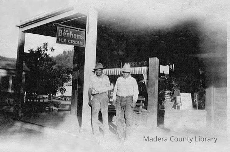 John Neal is shown here, with an unidentified man, at the Coarsegold Supply Company in Coarsegold, Madera County.Photograph Details