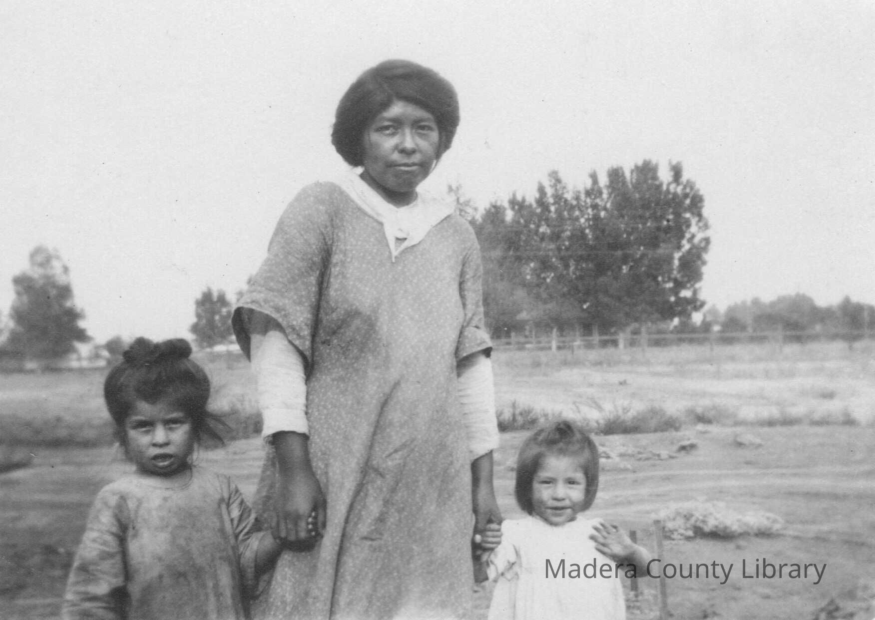 Ella Washington-Gonzales is shown here with her daughters, Mary Jane (left) and Rita (right). Ella was the daughter of George and Jennie Washington whose husband left her and the family when the girls were very young so Ella worked for a farmer in Clovis, Fresno County, California to support her family.Photograph Details