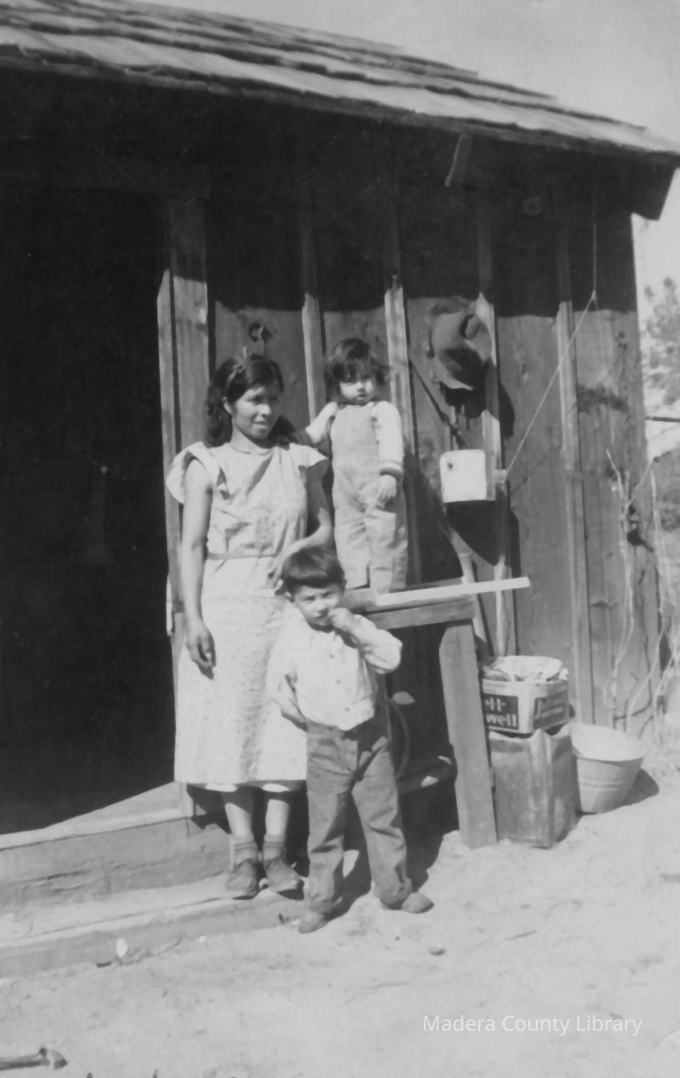 Mary Jane (Gonzales) Chenot at her home at Picayune Rancheria with her two sons, Ted (standing) and Hiram Chenot, Jr., May 1937.Photograph Details