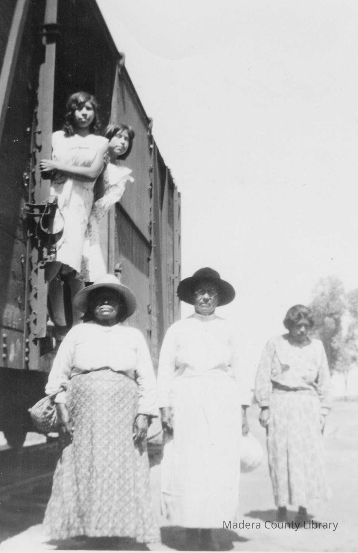 Ella (Washington) Gonzales and Rosie Washington with their mother, Jennie (Joaquin) Washington (center). Sisters Rita and Mary Jane Gonzales are on the train car.Photograph Details