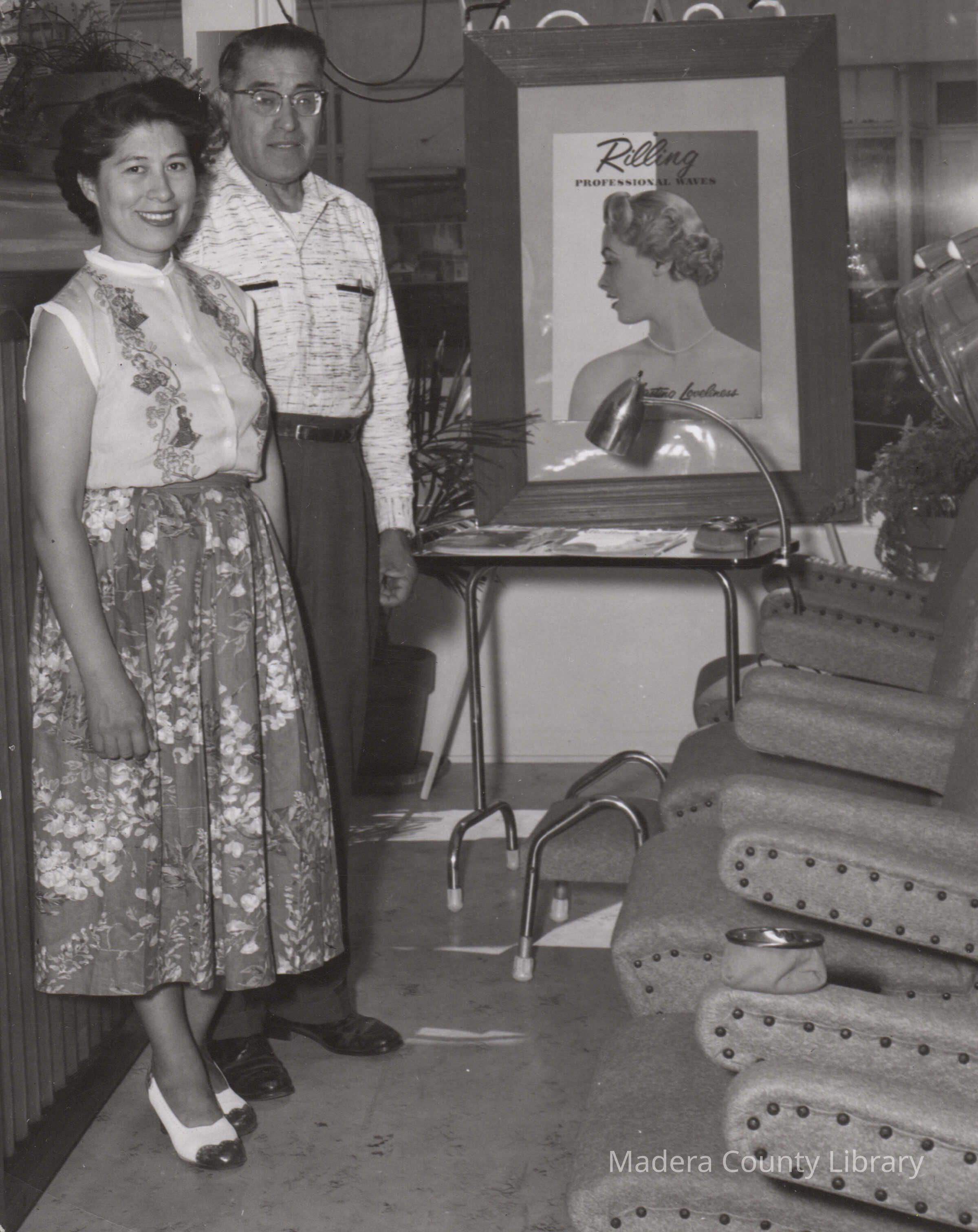 Nathaniel and Rita (Gonzales) Adame at their Beauty Salon near Hemet, California. This was the second of two salons that Nathaniel and Rita owned in Southern California.Photograph Details