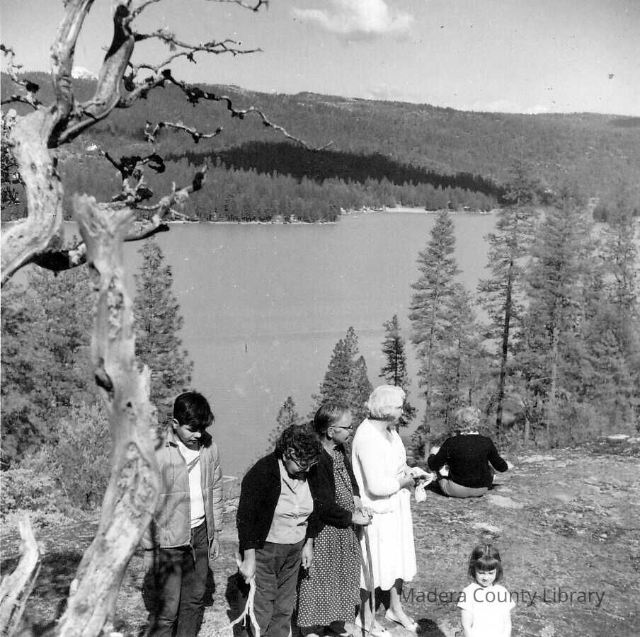 Dale Tex, left, with Ella Tex-McSwain, Annie Merritt-Tex, Nellie Williams and Family Members at the Way of the Mono Trail at Bass Lake, Madera County, California, 1963.Photograph Details