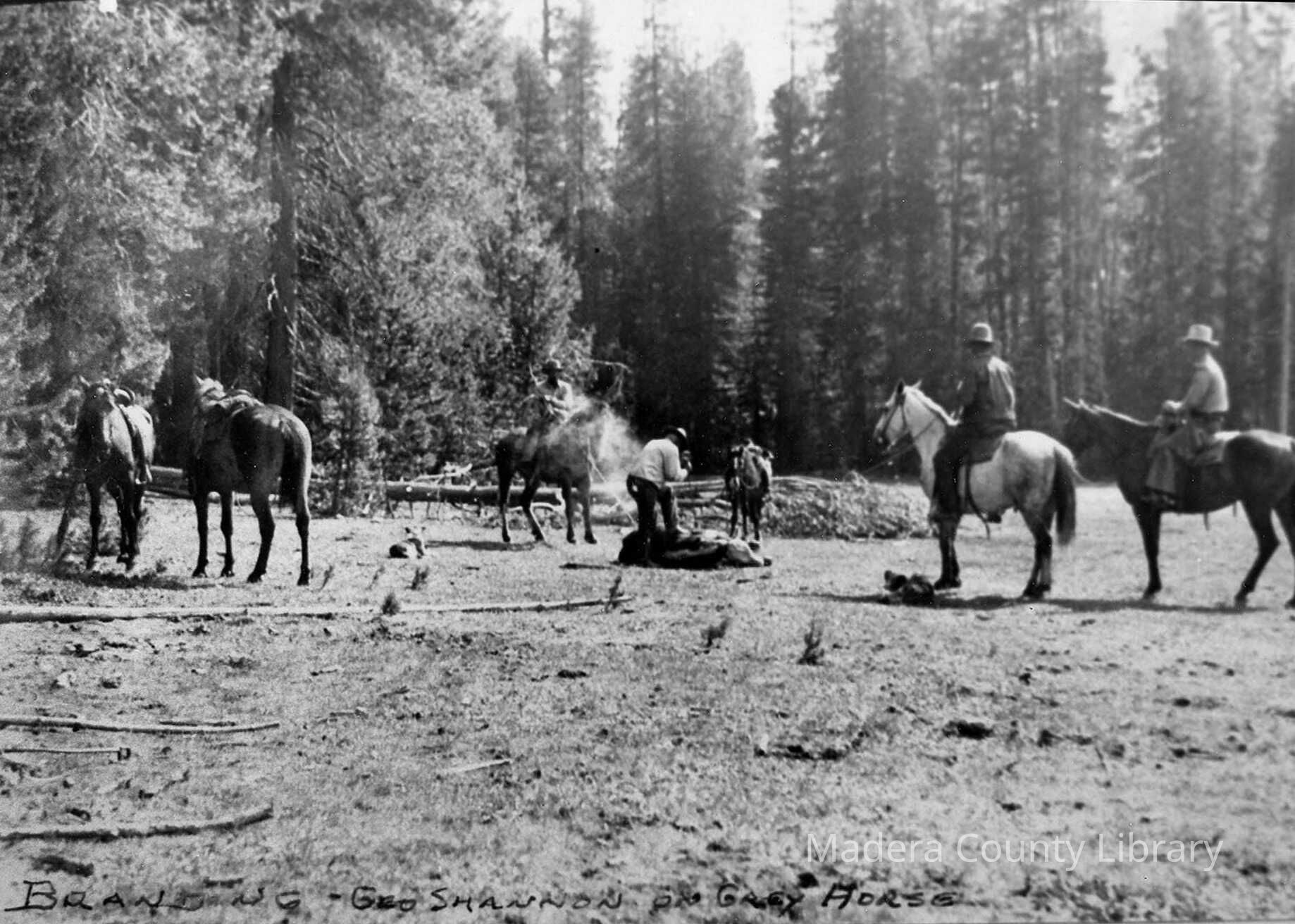 Members of the Jackass Cattlemen's Association branding cattle in the foothills of Madera County Please see "Madera Co-Operative Cattle Handling" in the Pacific Rural Press, July 31, 1920, for a full history and description of the Association.Photograph Details