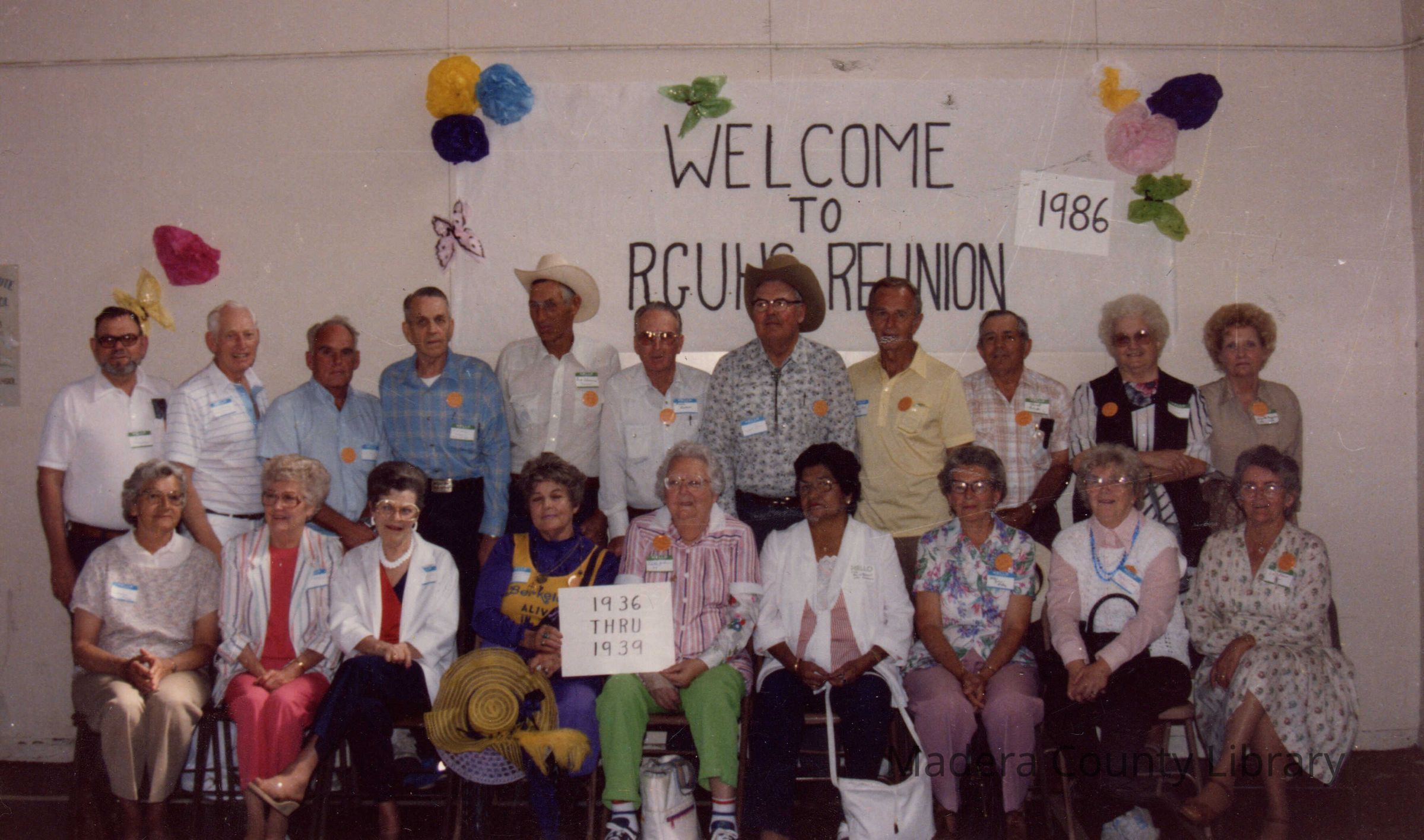 1936-1939 class members of the Raymond Granite Union High School at their Reunion in 1986. Harriet Lewis-Tex, front row, 4th from the right.Photograph Details