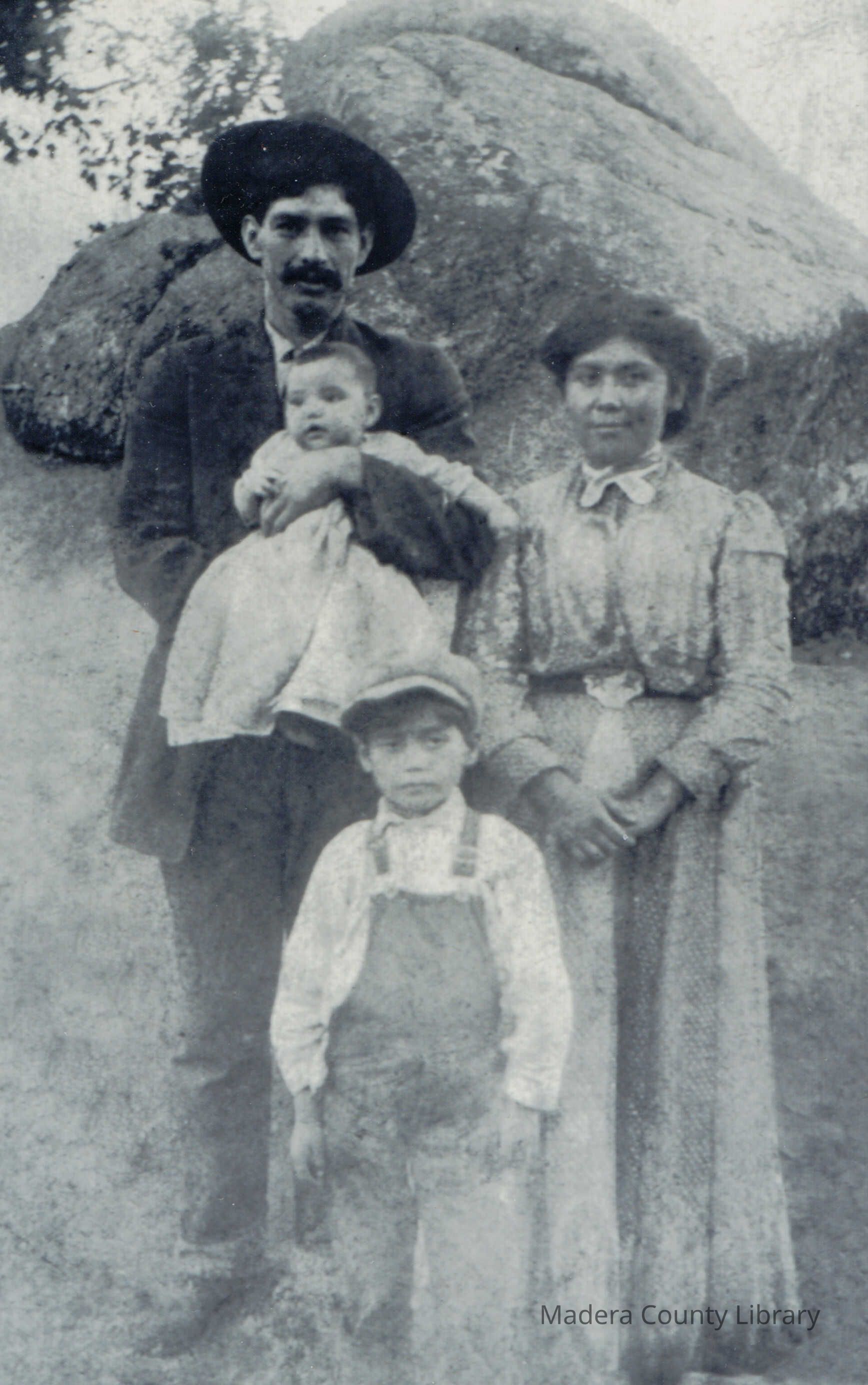 Tom and Josephine Jones-Lewis with two of their children, Ralph (standing) and Josephine the baby. Tom and Josephine were both Chukchansi Yokuts and raised their family in Madera County. Tom was a well known logger, miner and packer.Photograph Details