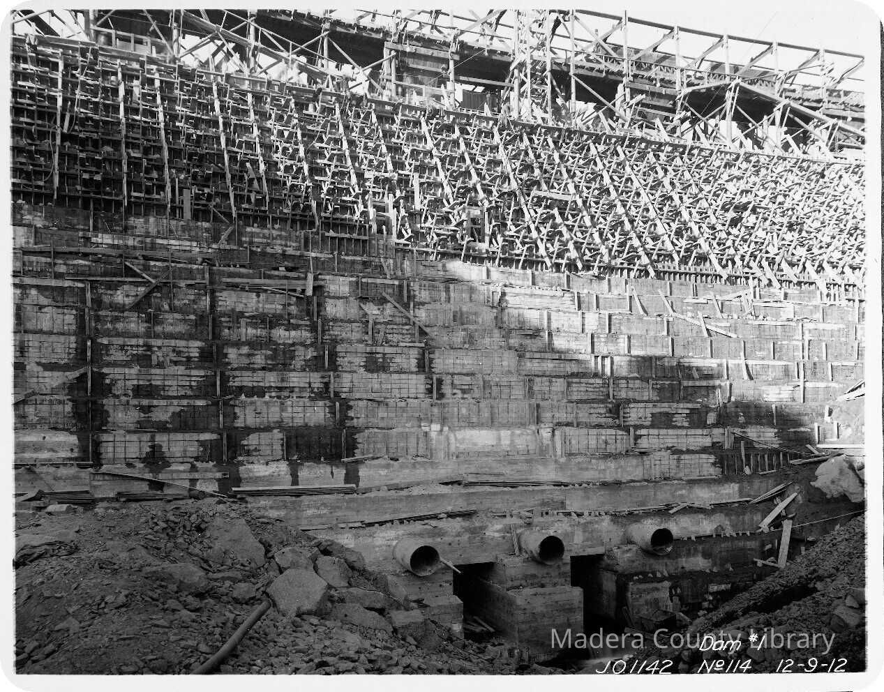In the summer of 1912, construction began on Dam #1 which was one of three dams that created present day Huntington Lake. By the fall of 1913, all three dams were completed however, they were not yet at their present height.Photograph Details