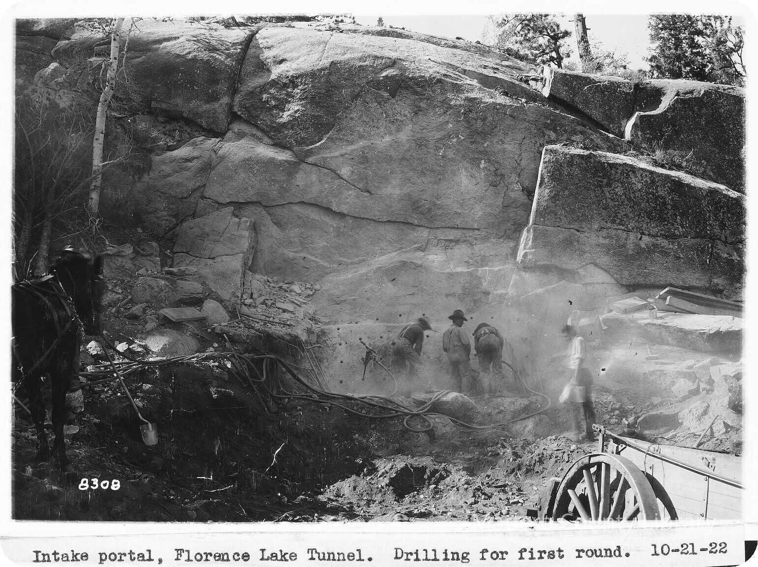 Drilling the first round at the intake portal at Florence Lake Tunnel.Photograph Details