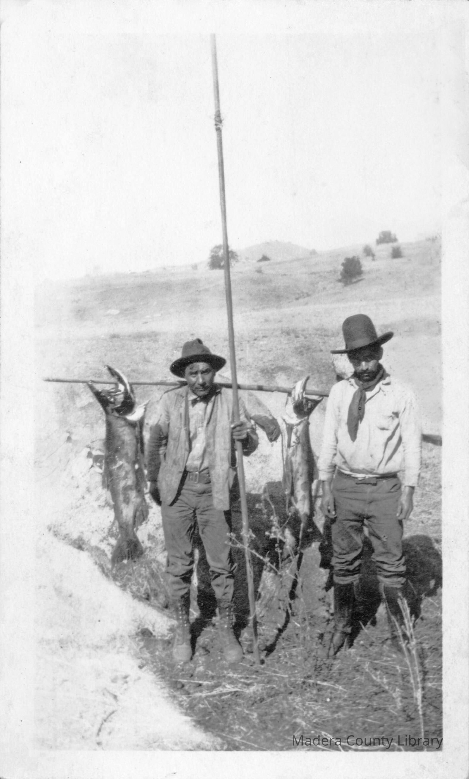 Unknown gentlemen after fishing for salmon near Friant, Fresno County. Notice the man on the left holding a traditional salmon spear.Photograph Details