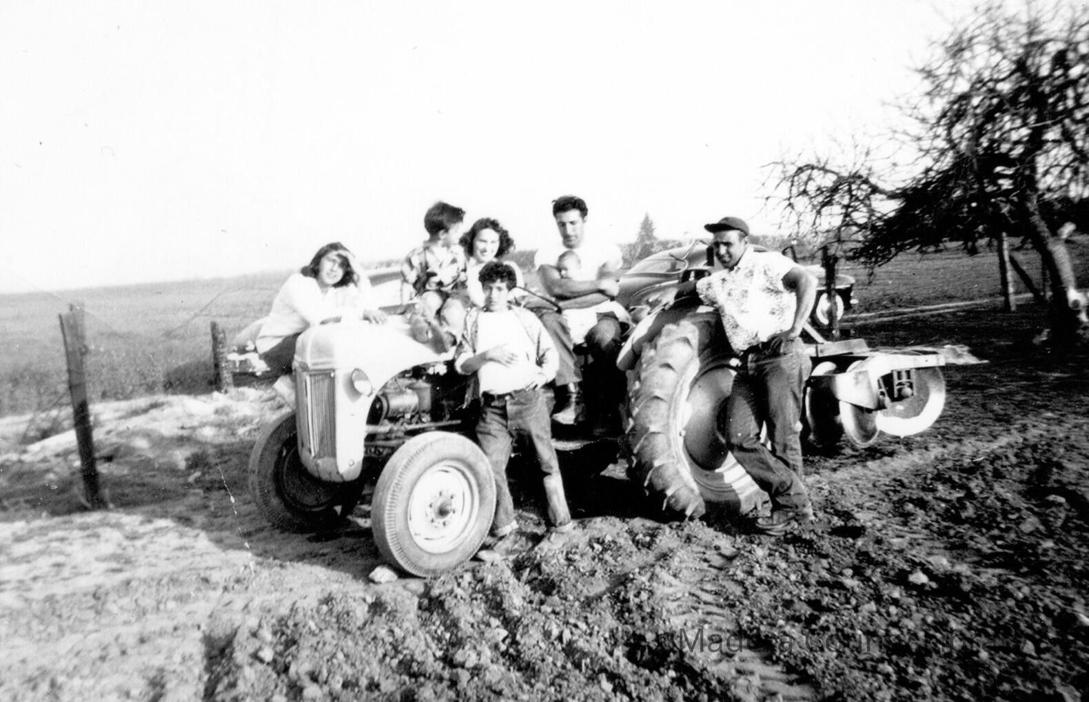 At the home ranch; Jane, Leo, Atomic, Rachel Amos holding Michael with Ted. They were planting cotton. In the background is a fig tree.Collection
