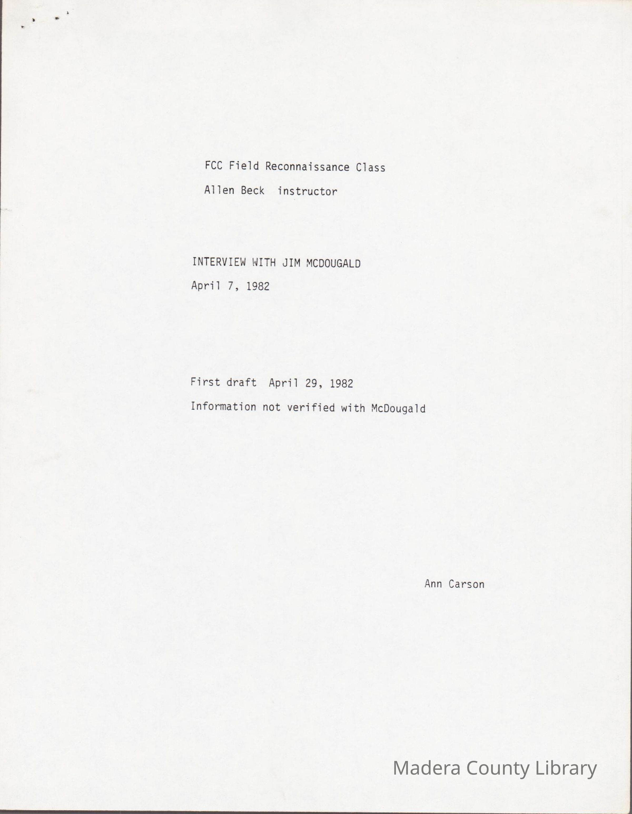 Interview with Jim McDougald conducted by the Fresno City College Reconnaissance Class on April 7, 1982Collection