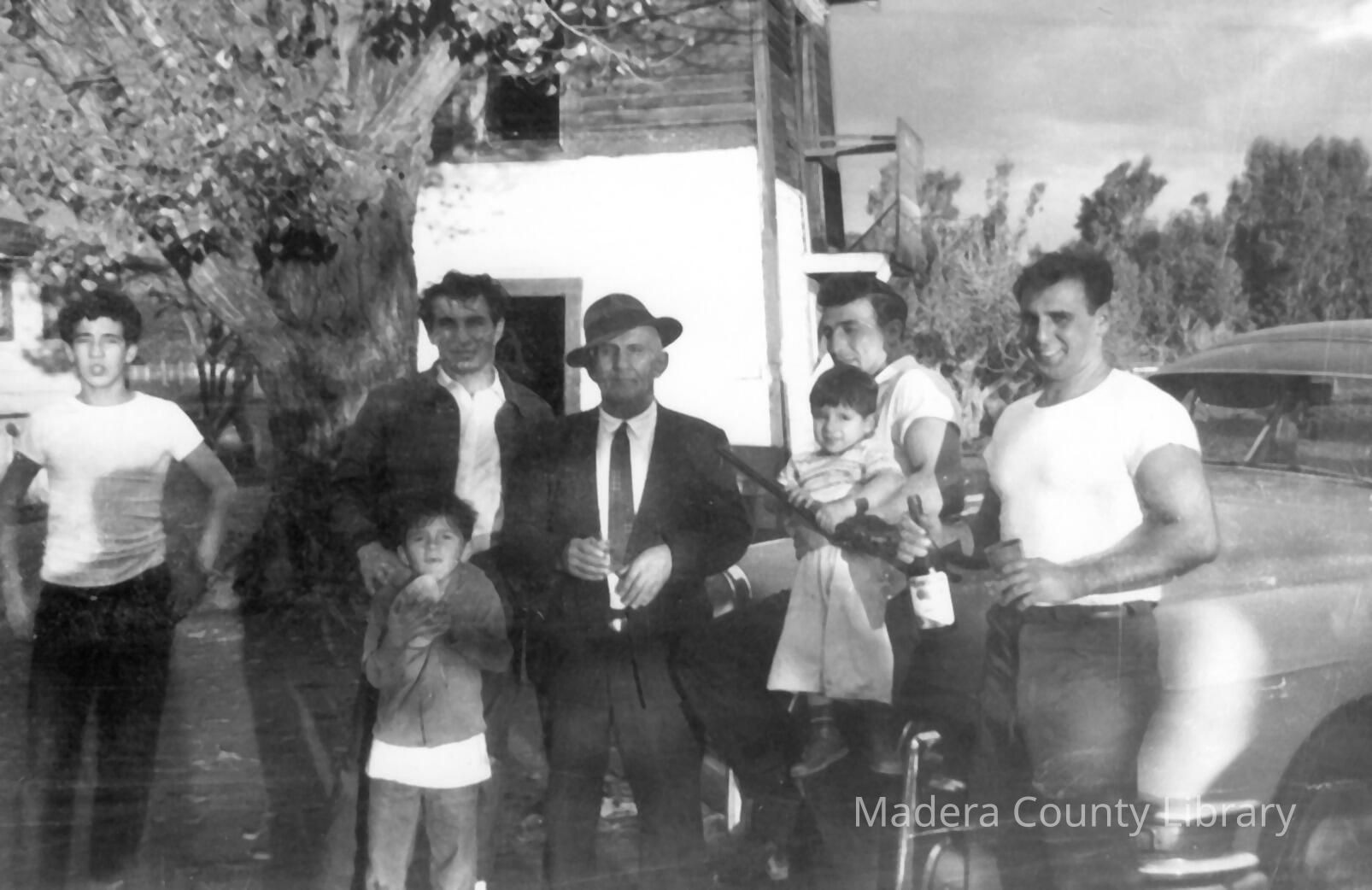 Leo, Haig, Atomic, Nazaret, Little Boy is Max (Ted's son), Steve holding Max and Ted. Ted has 6 kids in front of water tank at home ranch.Collection
