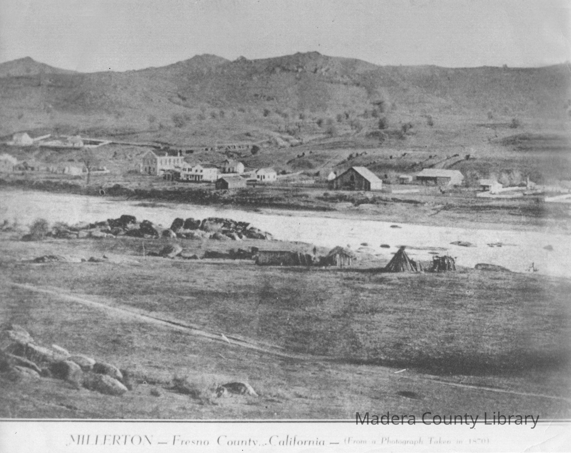 This picture reflects the town of Millerton as it would have looked in 1870. The Dumna (Yokuts) Village, Kuyu-Illik, is shown here nearest the San Joaquin River.Photograph Details