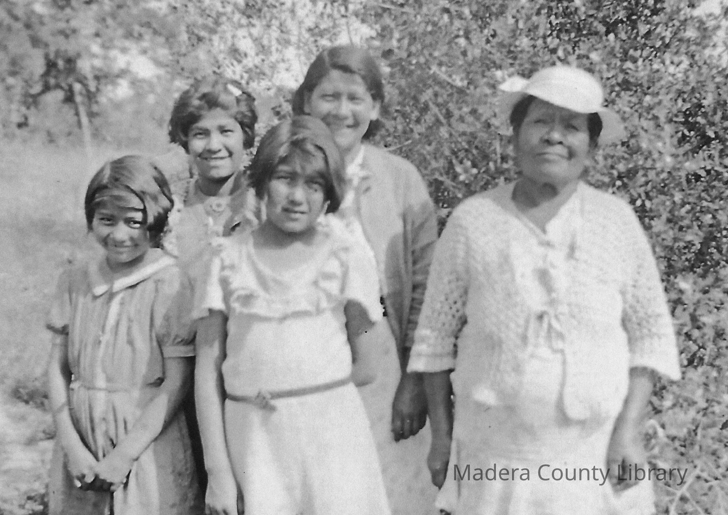 Members of the Chenot family taken at Picayune Rancheria in Madera County. Left to right; Inez, Josie, Julia, Louisa and Viola.Photograph Details