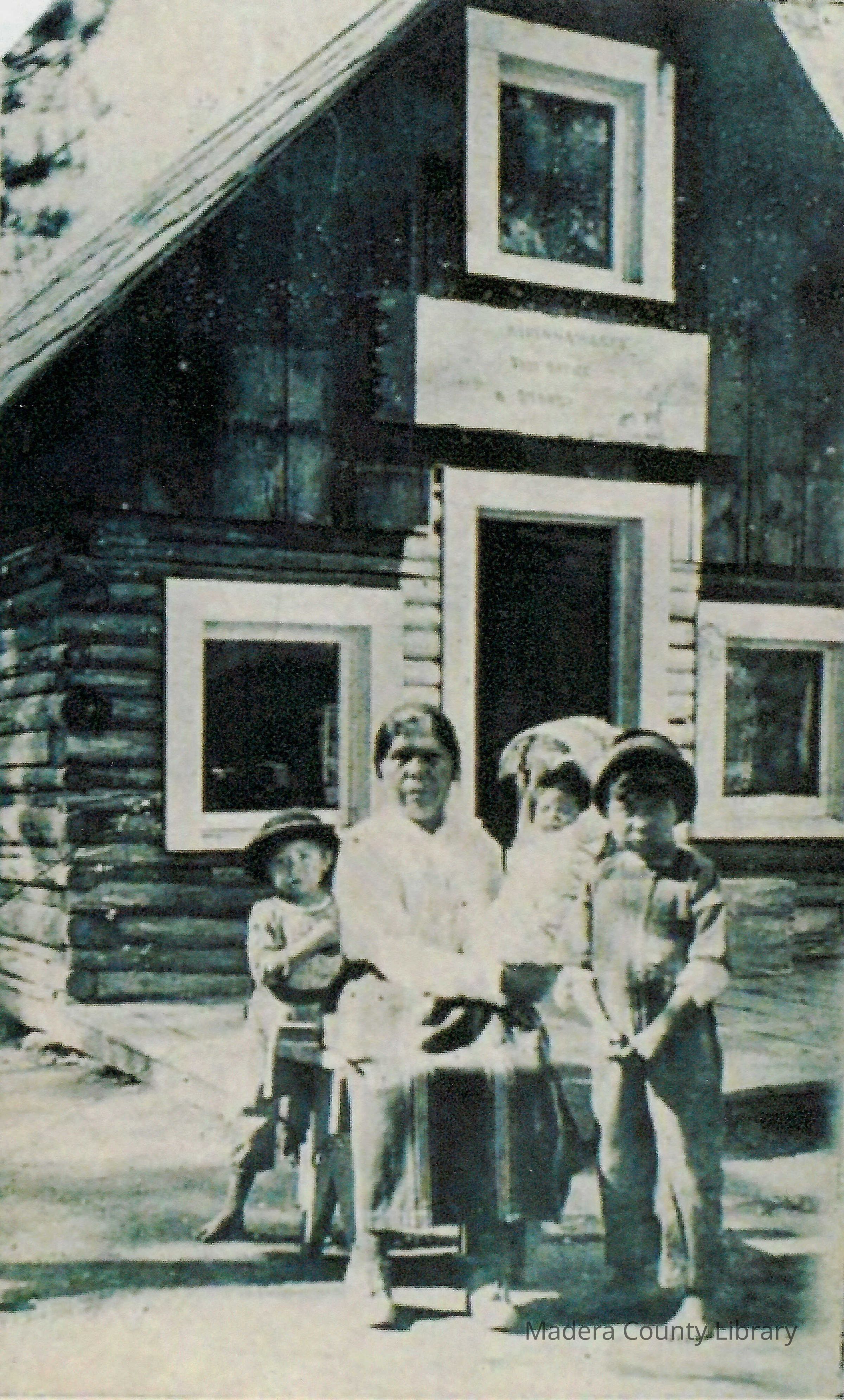 Lizzie Roan with her children, Maynard Saragoza, Bernice Graham and Franklin Saragoza in front of the Nipinawassee Post Office in Madera County.Photograph Details