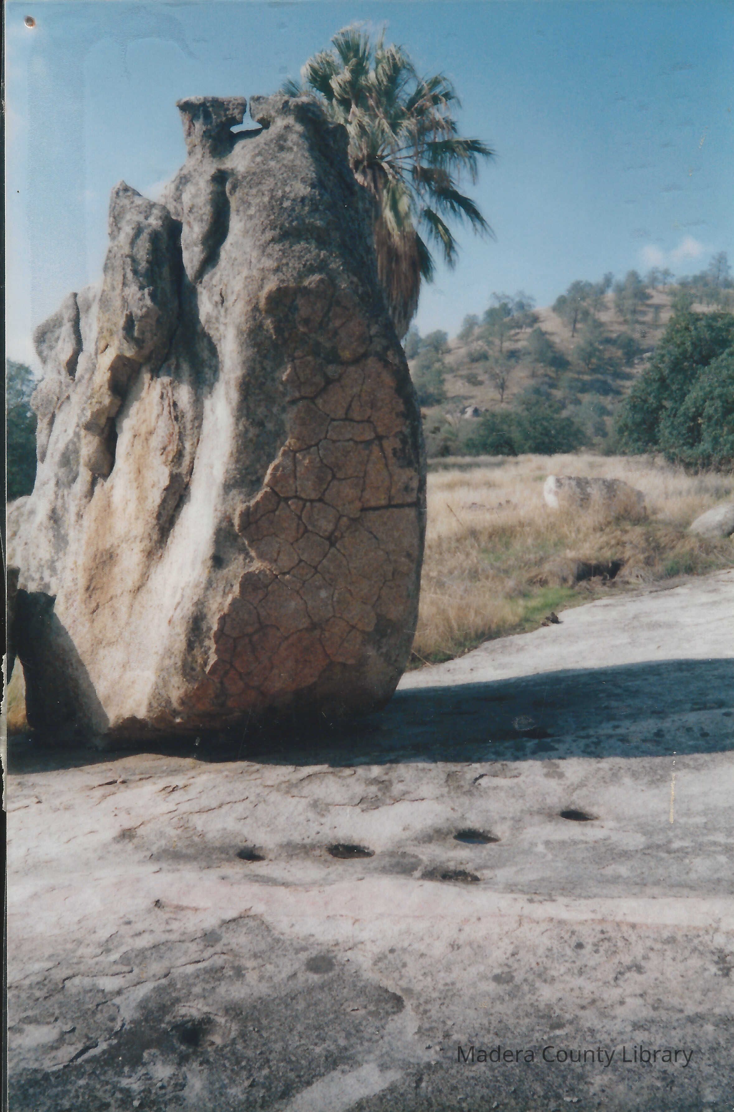 Another view of the grinding rock located west of Blackhawk Lake near Yosemite Lakes Park in Madera County. Notice the Palm Tree, which is not native to this area, located in the background. The tree grew in front of a very old building which is no longer standing.Photograph Details