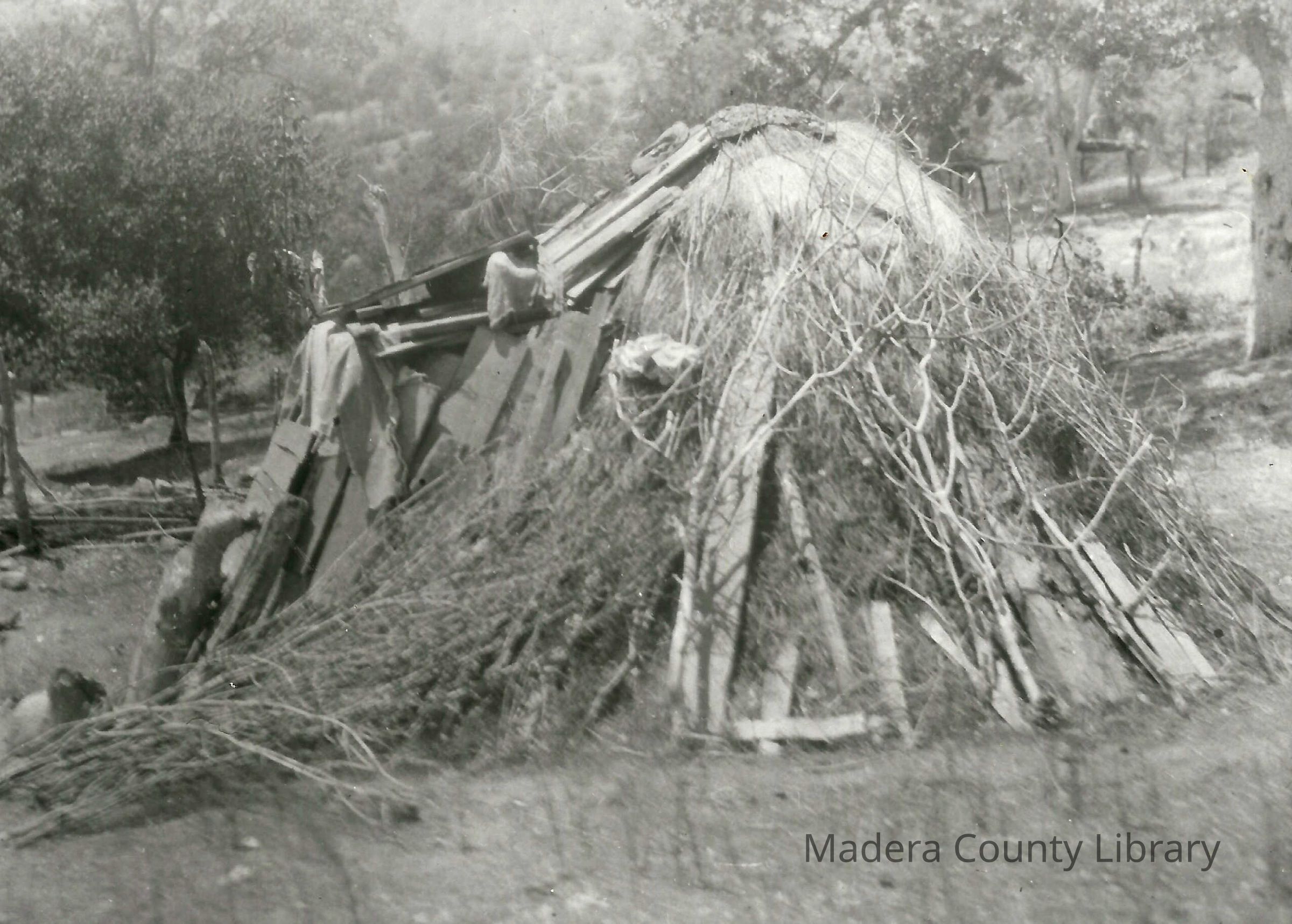 This photo reflects a traditional Mono home made of brush and bark. This home was located at Yatsaiyau, which was home to Ole' Johnson.Photograph Details