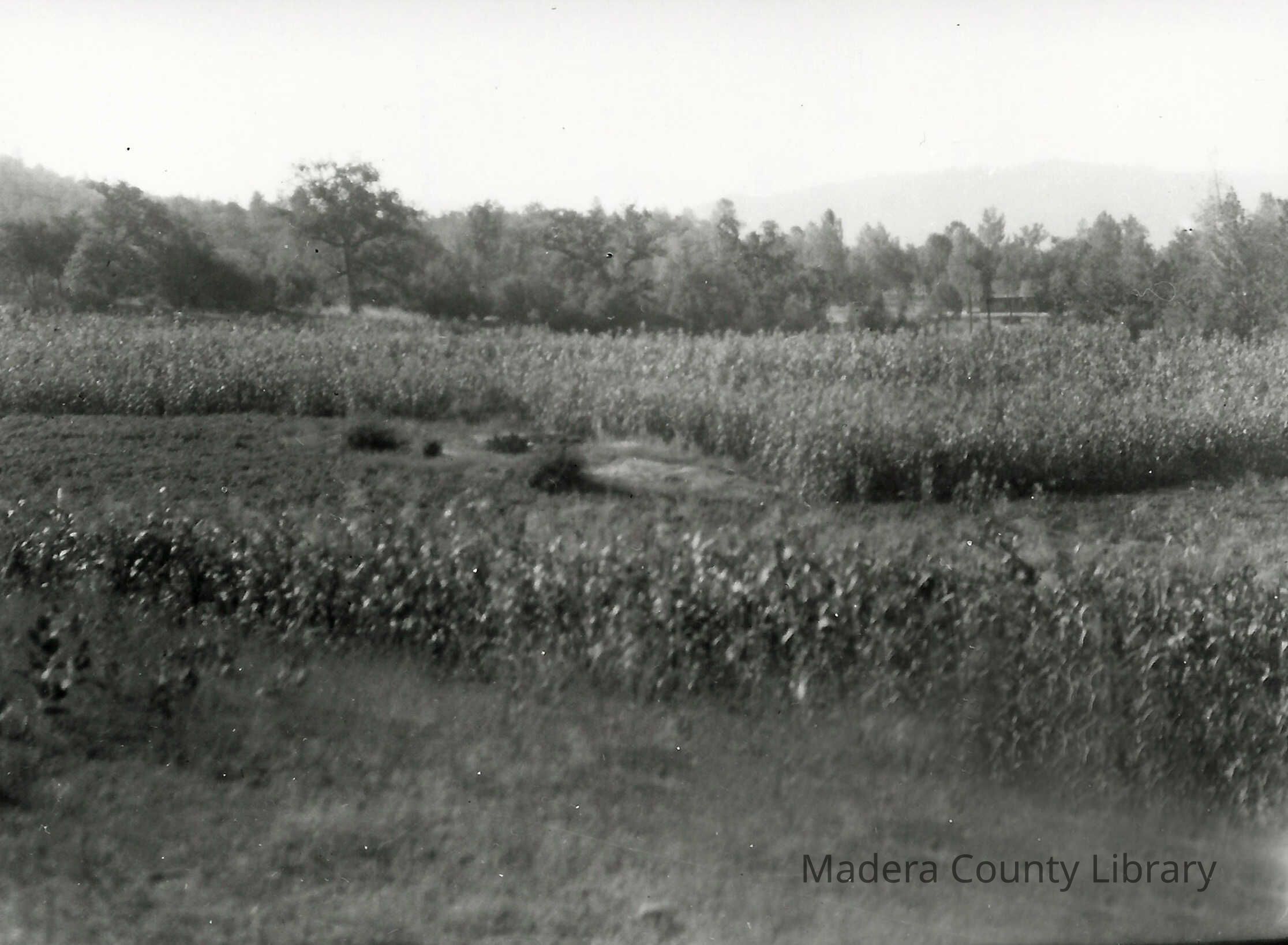 Photo reflects a granite outcrop of mortar holes surrounded by corn, located at Dedabikanu, which was an old village site located south of Whiskey Creek in Madera County.Photograph Details