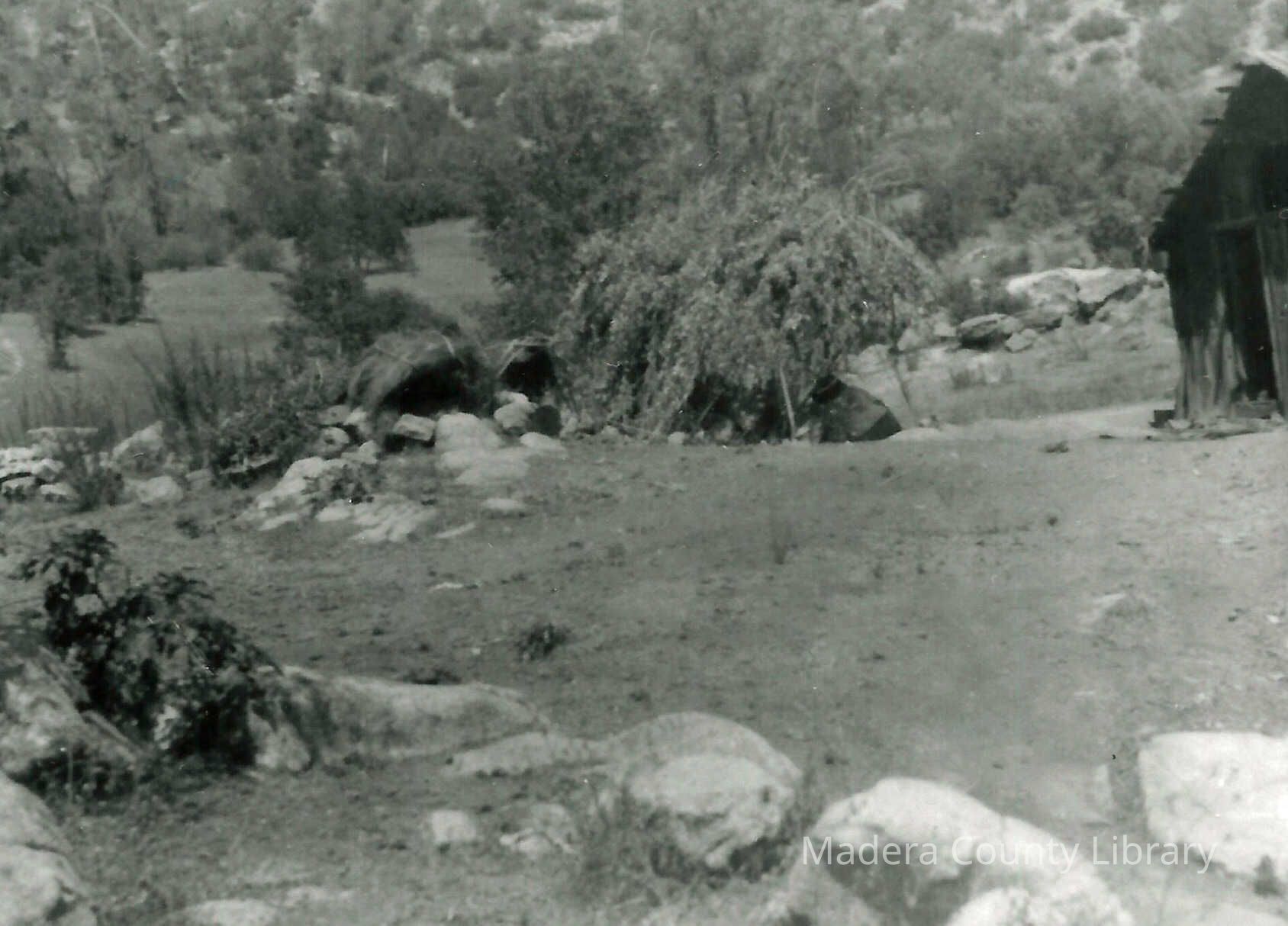 Tasineu Village was home to the Charlie Family. Notice the shade covering for their grinding rock.Photograph Details