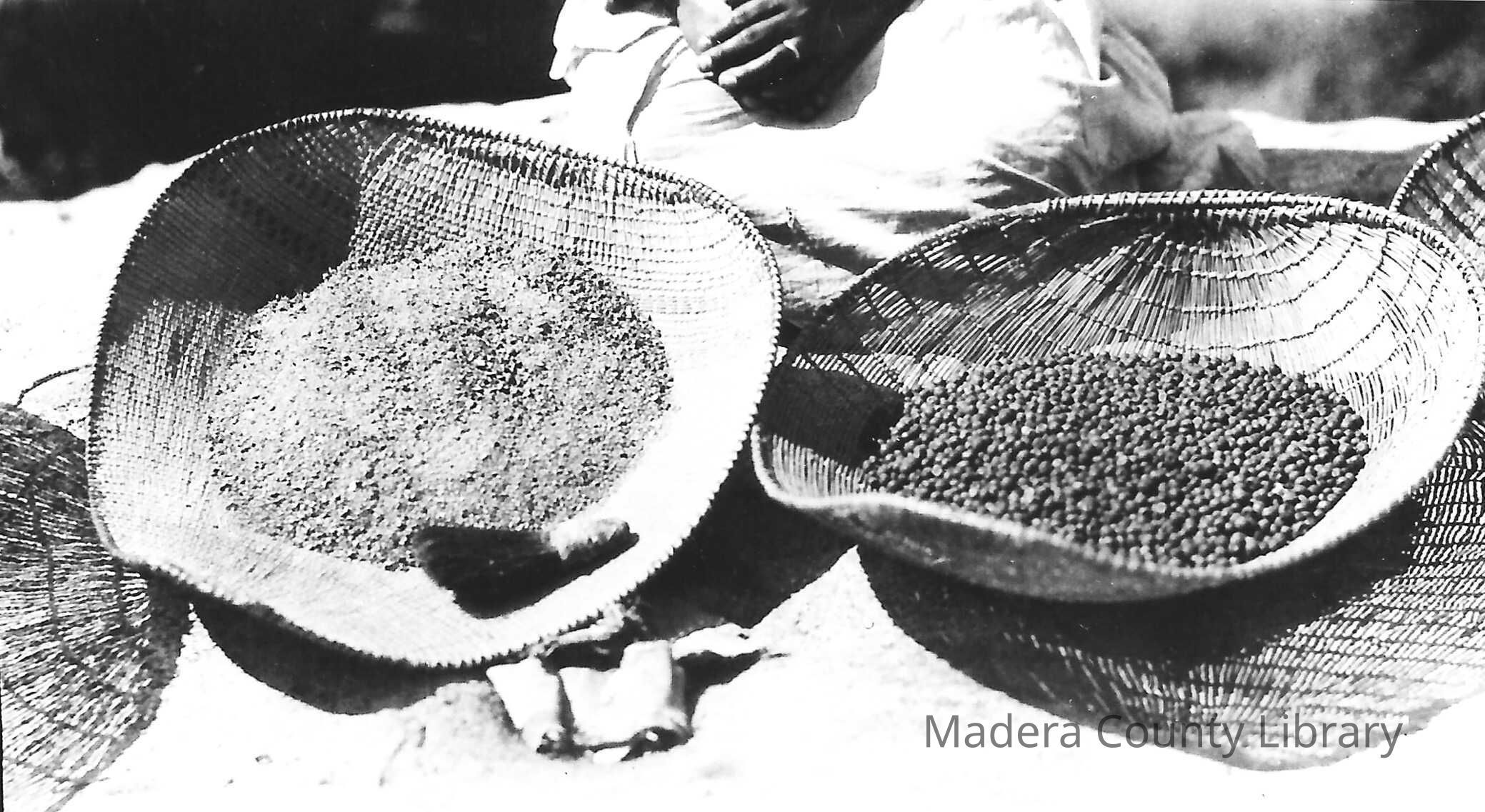 Two winnowing baskets are shown here containing manzanita meal on the left, and uncrushed manzanita berries on the right. Winnowing is a process where the berries, or acorns, are tossed in the air, allowing the lighter material to blow away and the berries, or nuts, fall back into the basket.Photograph Details