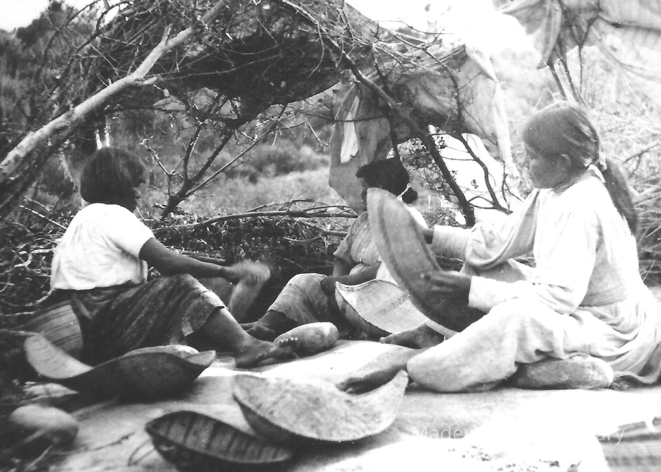Shown here are a group of women who are grinding and winnowing acorns. Shallow mortars, typically 3" or less in depth, were used for pounding acorns into acorn meal. Deeper than 3" was used for seeds (Gifford, E.W. "North Fork Mono", p. 24). After cracking the acorns, the nuts would be placed in a winnowing basket to remove small particles left on the nut. After, the nuts would then be ground in to acorn meal to be used for an acorn soup or pudding.Photograph Details