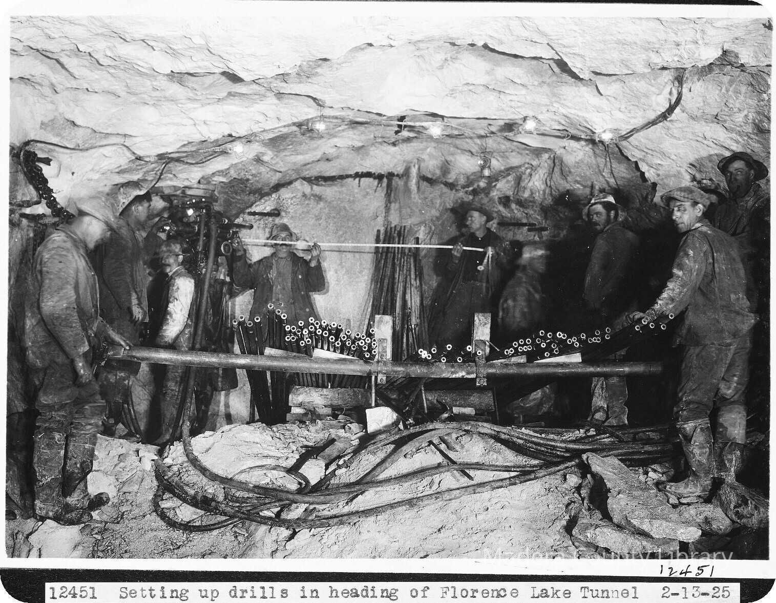 Setting up drills in heading of Florence Lake Tunnel.Photograph Details