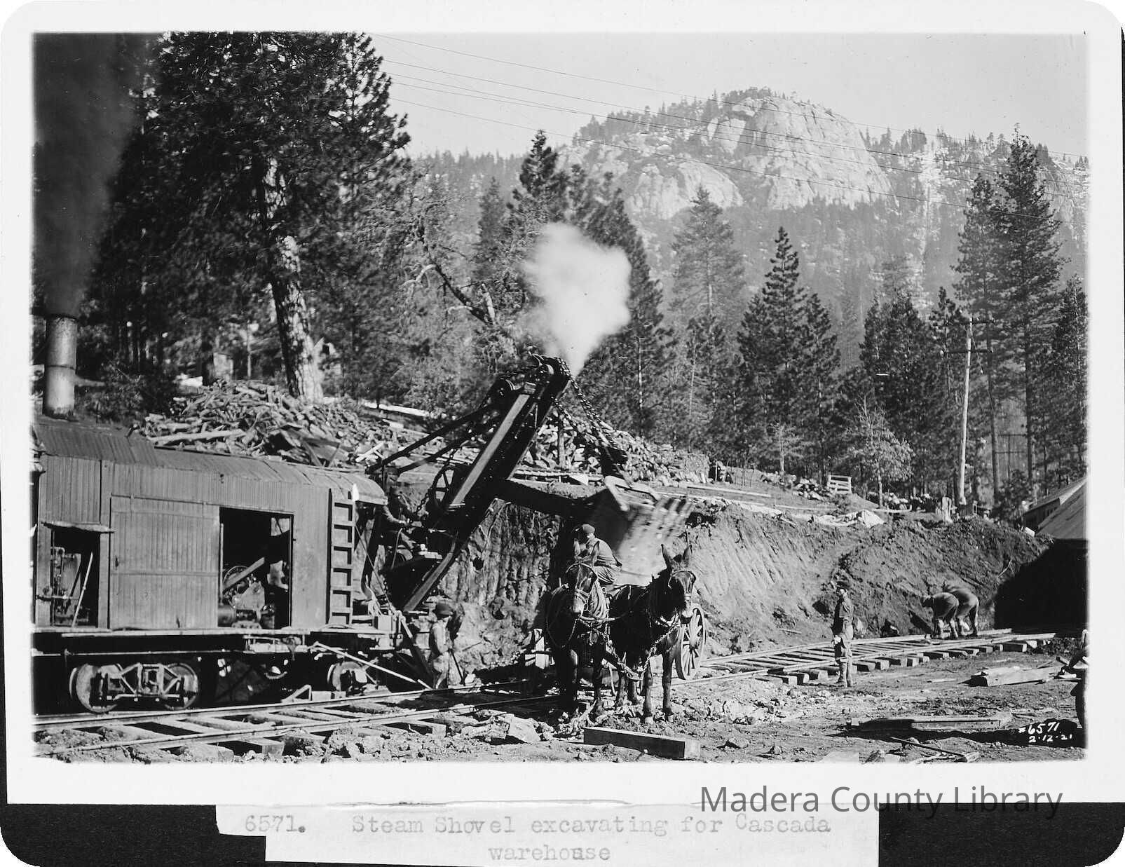 Steam shovel and donkeys excavating for Cascada warehouse.Photograph Details