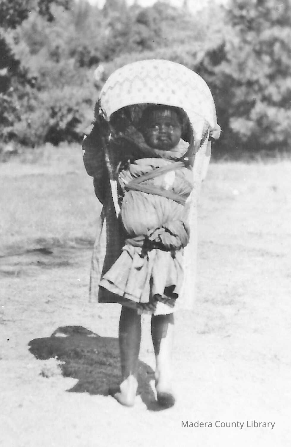 Shown here is a young girl carrying a baby in a cradle basket in North Fork, ca,. 1904. Baby cradle basket hood design sometimes denotes the sex of the baby, parallel or straight lines for a boy, and a zigzag pattern for a girl. From the design of this hood, it would appear it was made for a little girl.Photograph Details