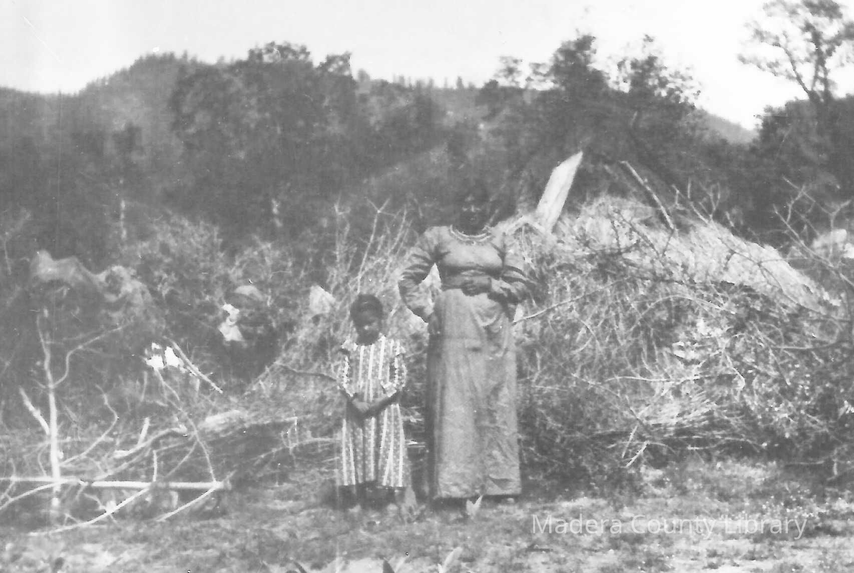 Mono woman, with daughter, in front of Brush Hut, ca. 1904Entry/Object ID