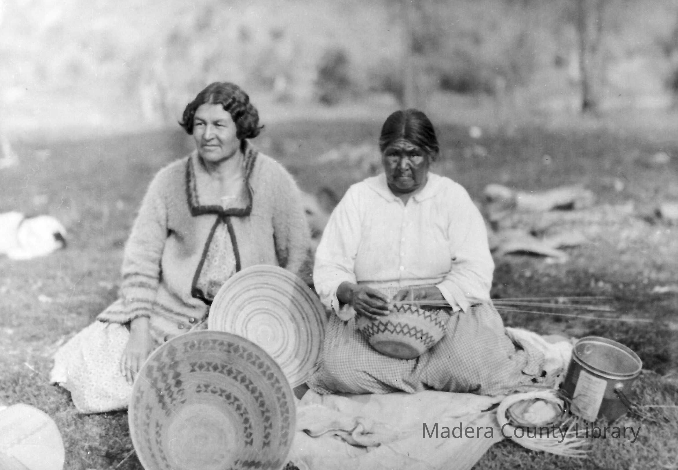 Shown here is a picture taken between 1905-1930 of two Mono women, one who is making a coiled basket.Photograph Details