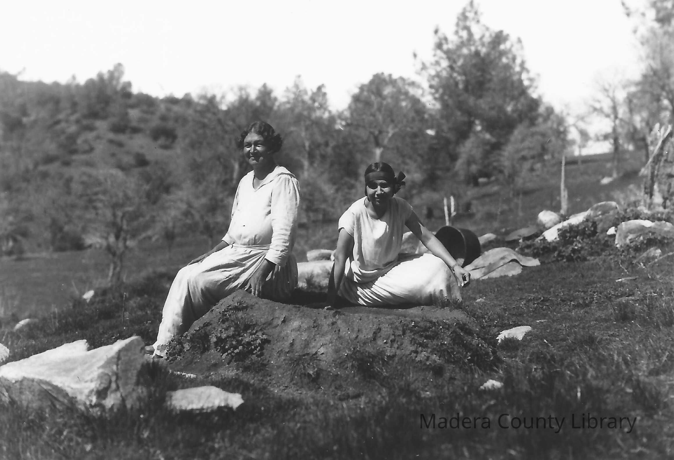This photo reflects two women sitting on a dirt mound. A closer look at this picture reveals the woman on the left is enjoying a spring that today, can still be found on the property.