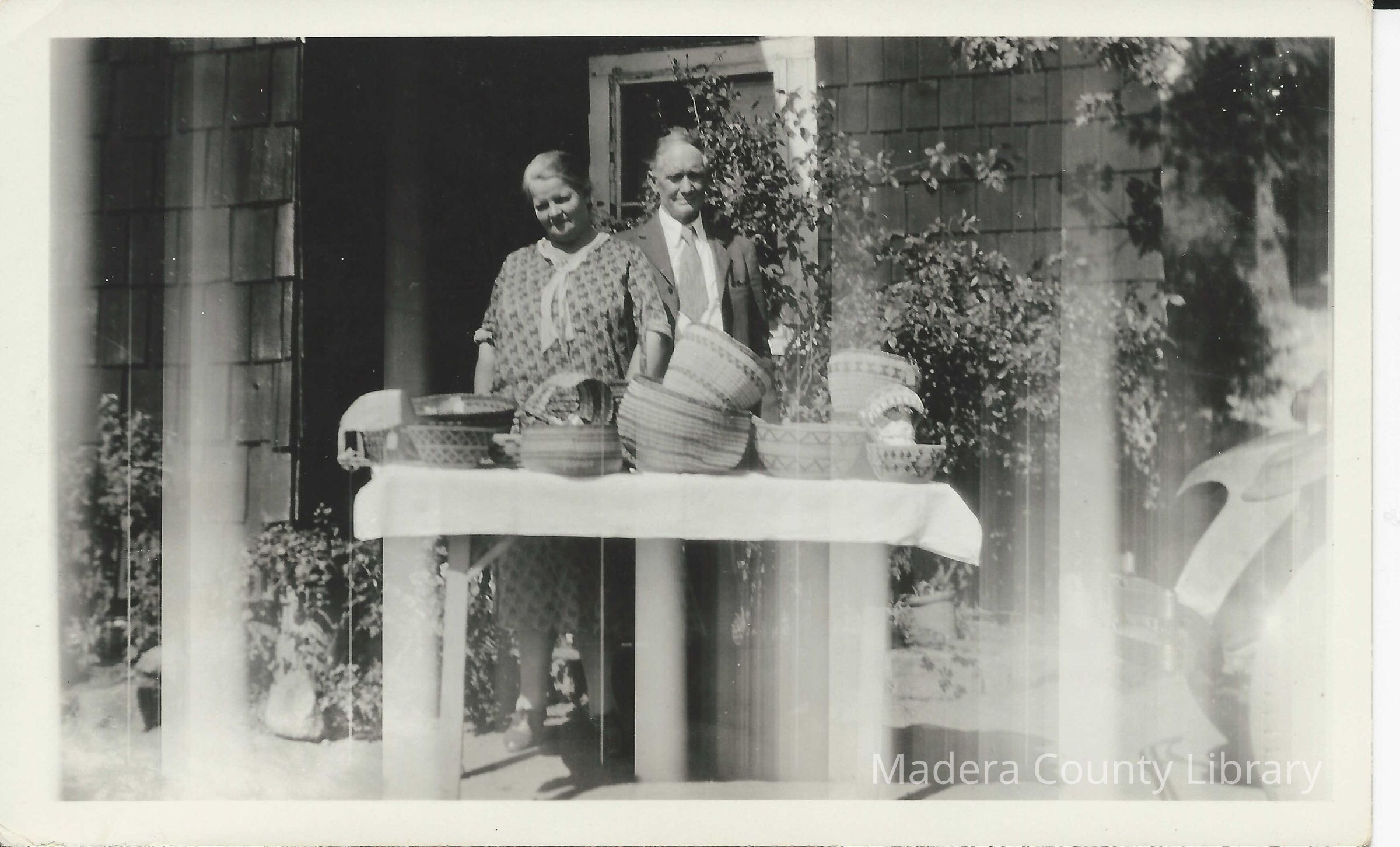 Unidentified couple at the North Fork Mission displaying their Indian Baskets.Photograph Details