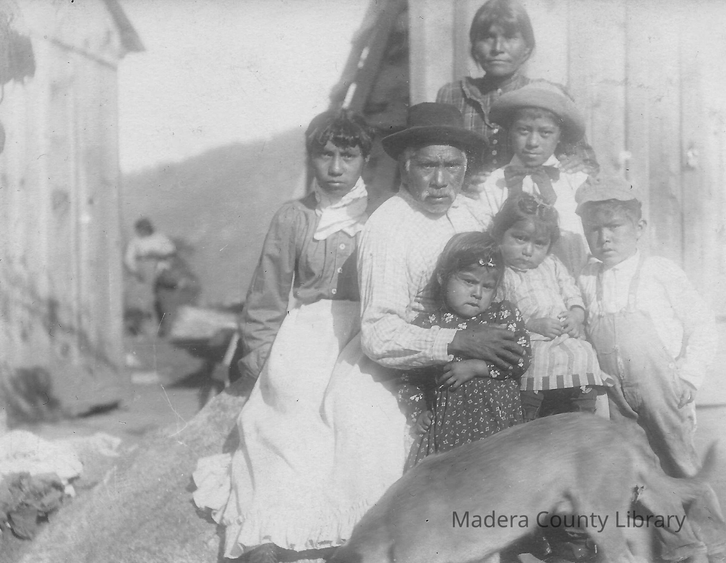 Pictured is Willie Chepo with his wife, Mary Ann and their children, nieces and nephews. Top of the picture is Mary Ann Chepo, in front of Mary is Joe Chepo, her son. The little boy at the right of the picture is Steve Chepo (father was Wilson Chepo). Willie Chepo is pictured in the middle with the black hat and on his lap is Belinda Chepo (father was Wilson Chepo), and in front of her is Mary Chepo, Willie's daughter. The young girl to the left of the picture is believed to be Maude Chepo was was the daughter of Jim Chepor. Willie, Jim and Wilson were brothers and North Fork Mono Indians.Photograph Details