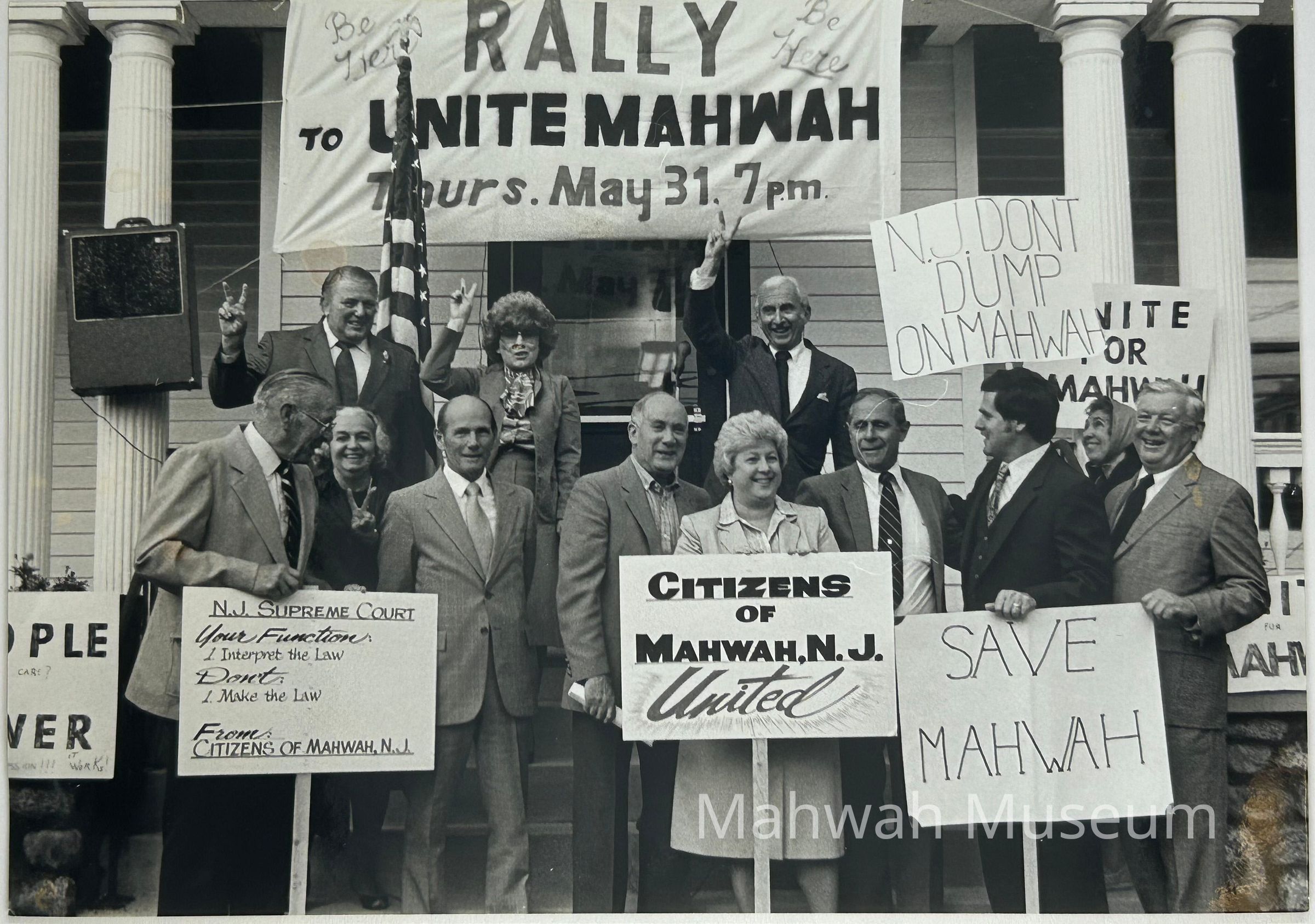 A photograph of the Mahwah Rally at the Municipal Building against Mt. Laurel II. The people in the photo are members of the Township Committee and the New Council. The photo was taken by Lee Vold on May 31st, 1984.