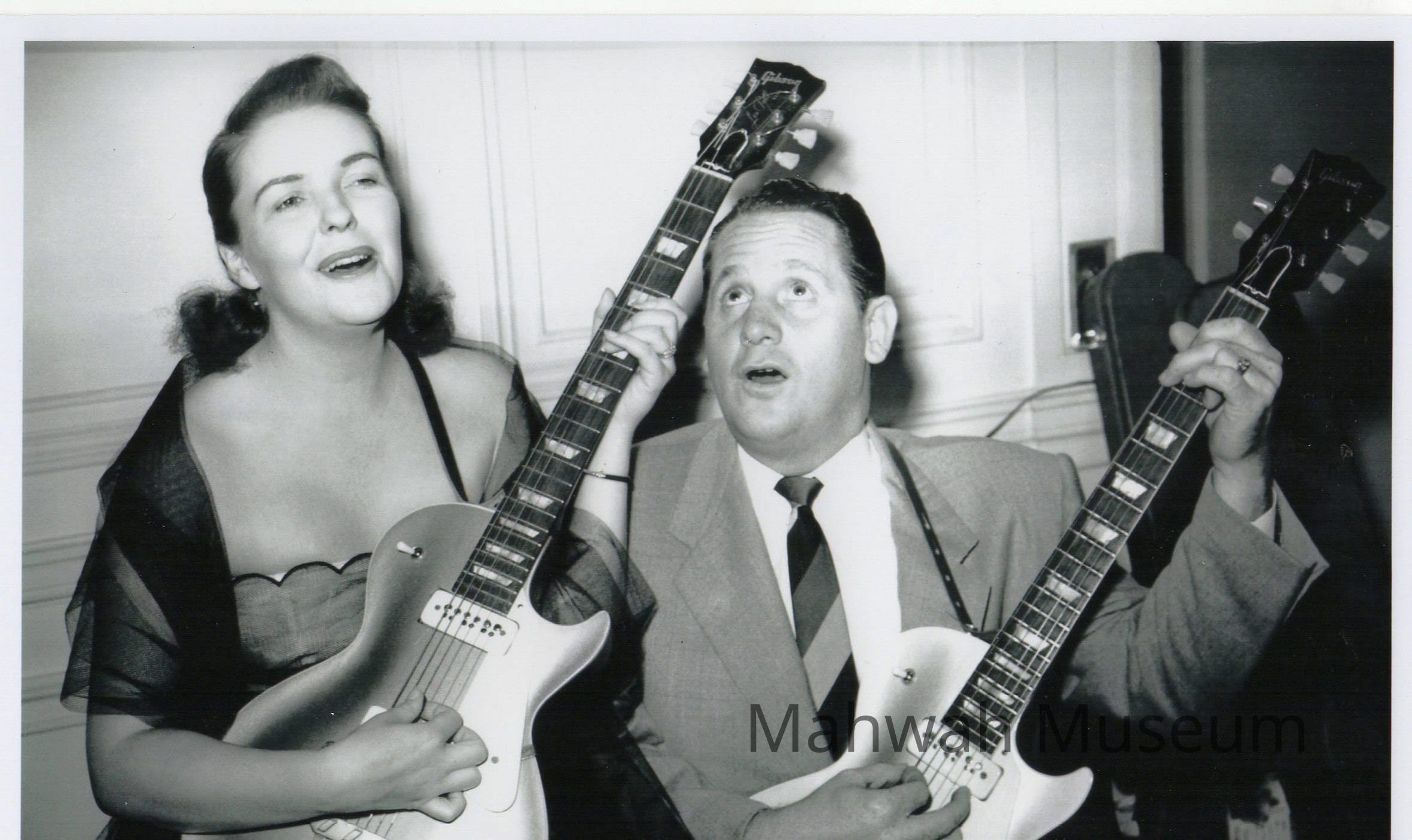 Black and white photo of Les Paul and Mary Ford singing and playing guitarsPhotograph Details