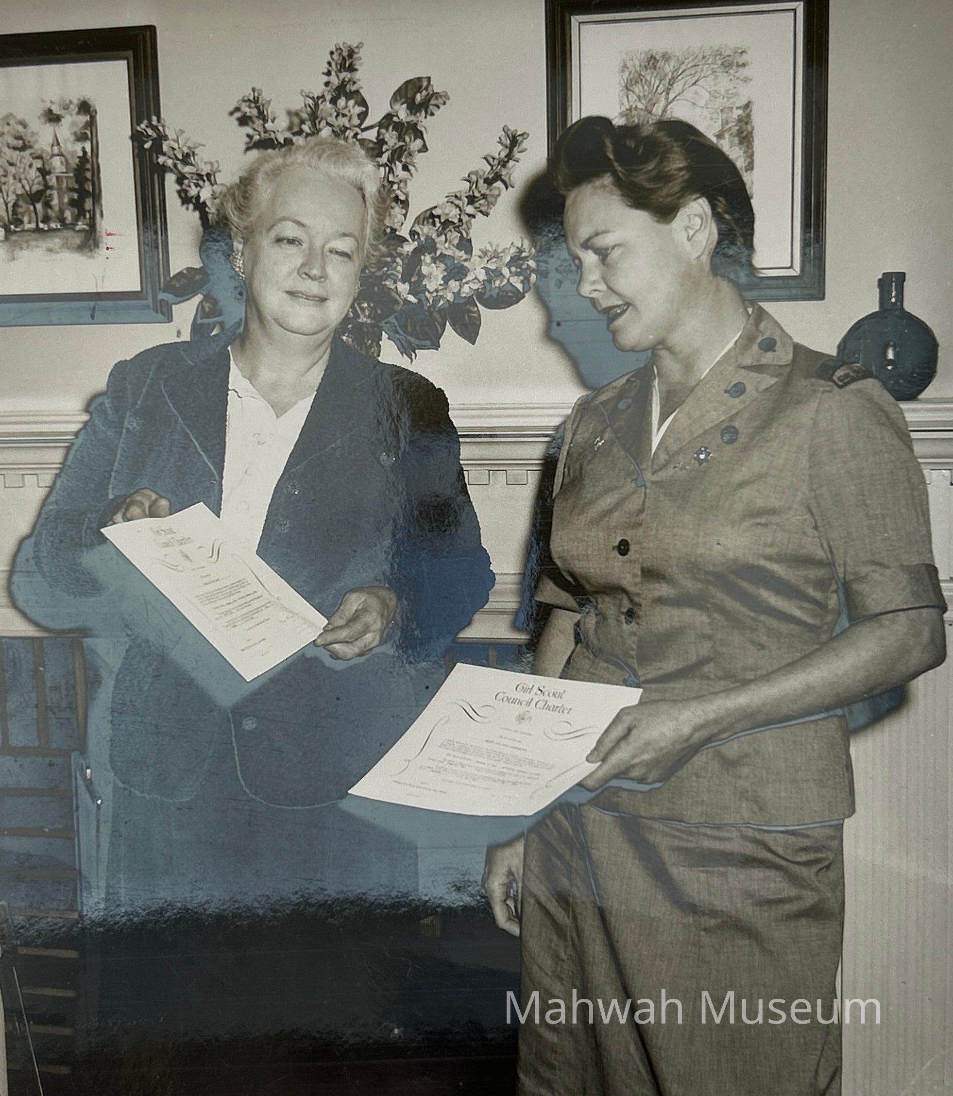 Mrs. Vivian Skues, President of the Mahwah Girl Scout Council and Mrs. Jannett Ford, president of the Ramsey Girl Scouts exhibiting their chartersPhotograph Details