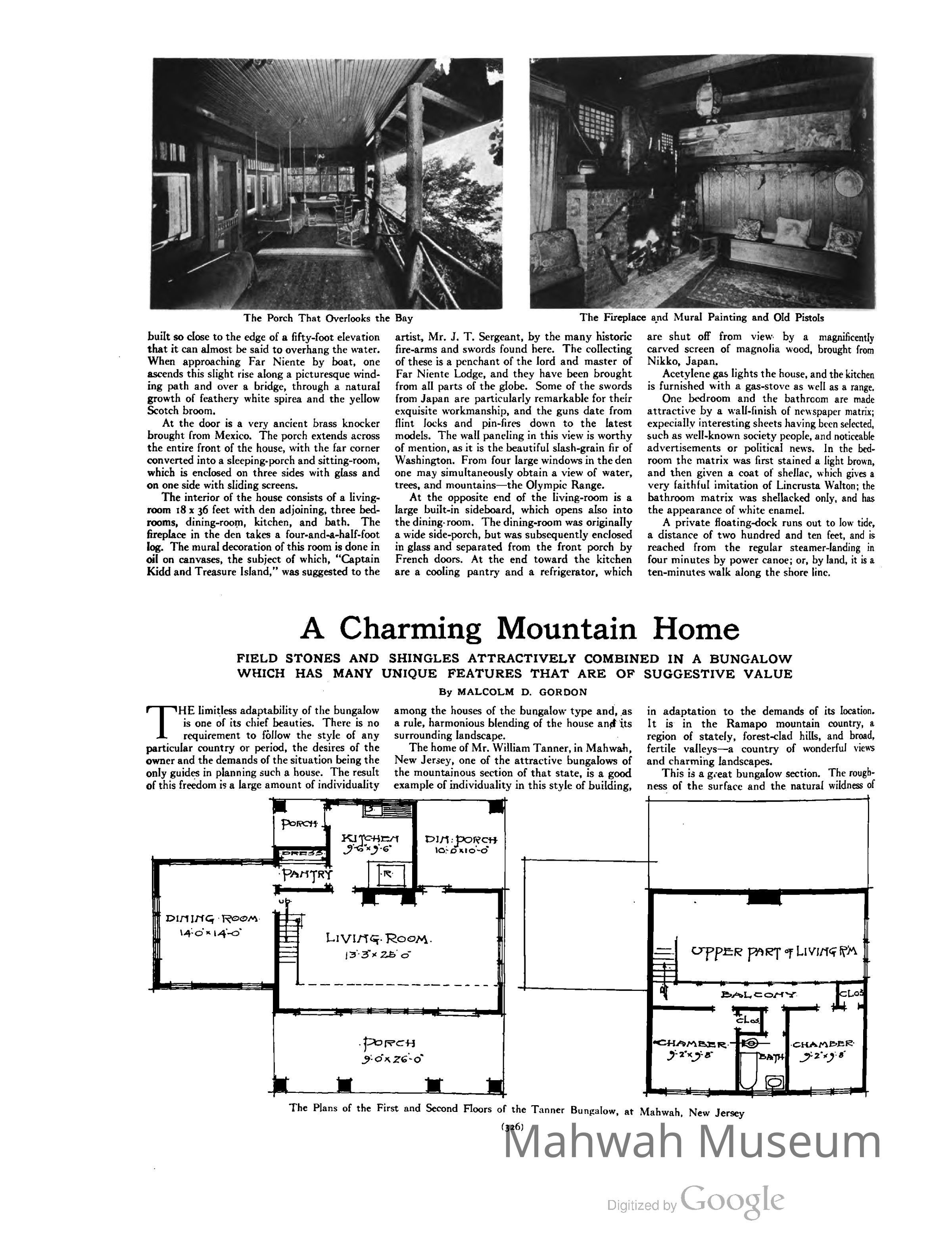Article about William Tanner's bungalow in the Ramapo Mountains, contains a floor plan, exterior image and interior image.
