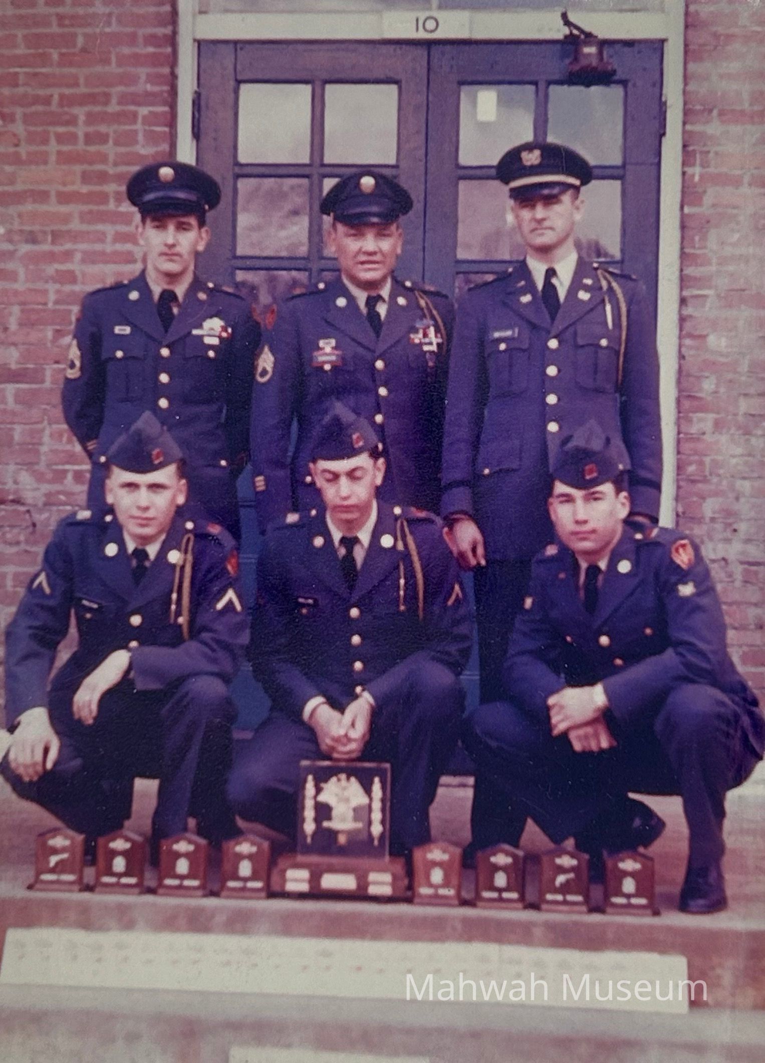 A photograph of the Battery B 5th Missile Battalion pistol team. They were the winners of the First REgion USARADCOM Commanders trophy. The team was the sergeant standing in the middle and the three in the front row.Photograph Details