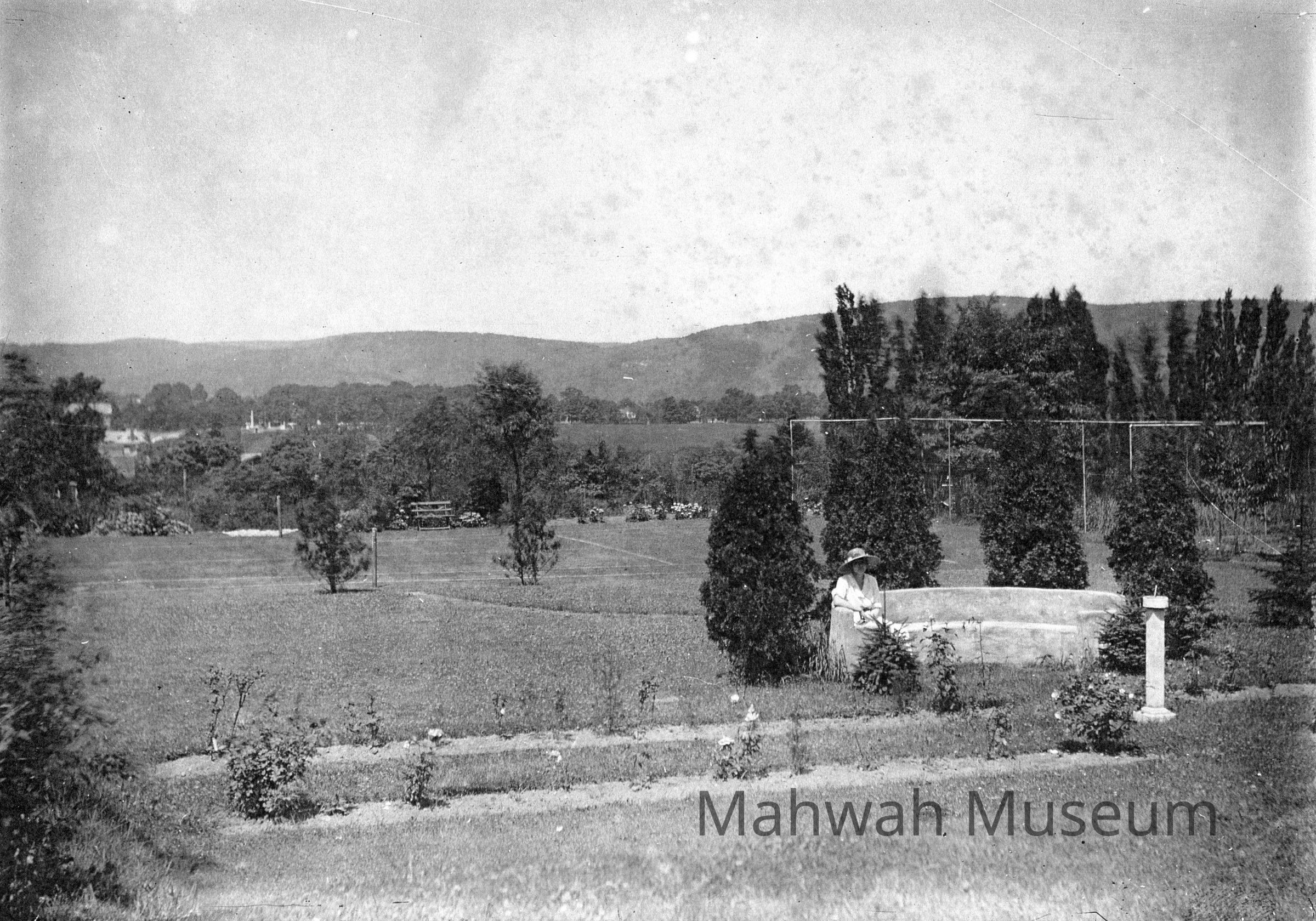 Reformed Church cemetary left rear, middle of picture. Looking West, Miller Road on left and Winter Street in middle of picture running horizontally. Elizabeth Twyford seated on bench.Photograph Details