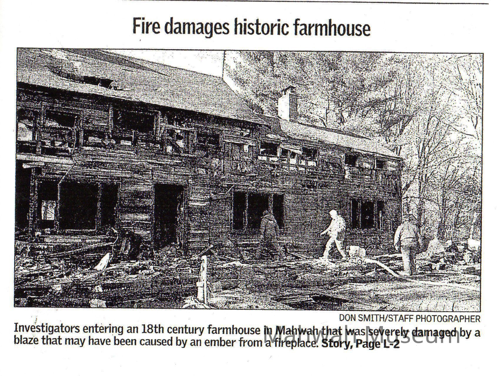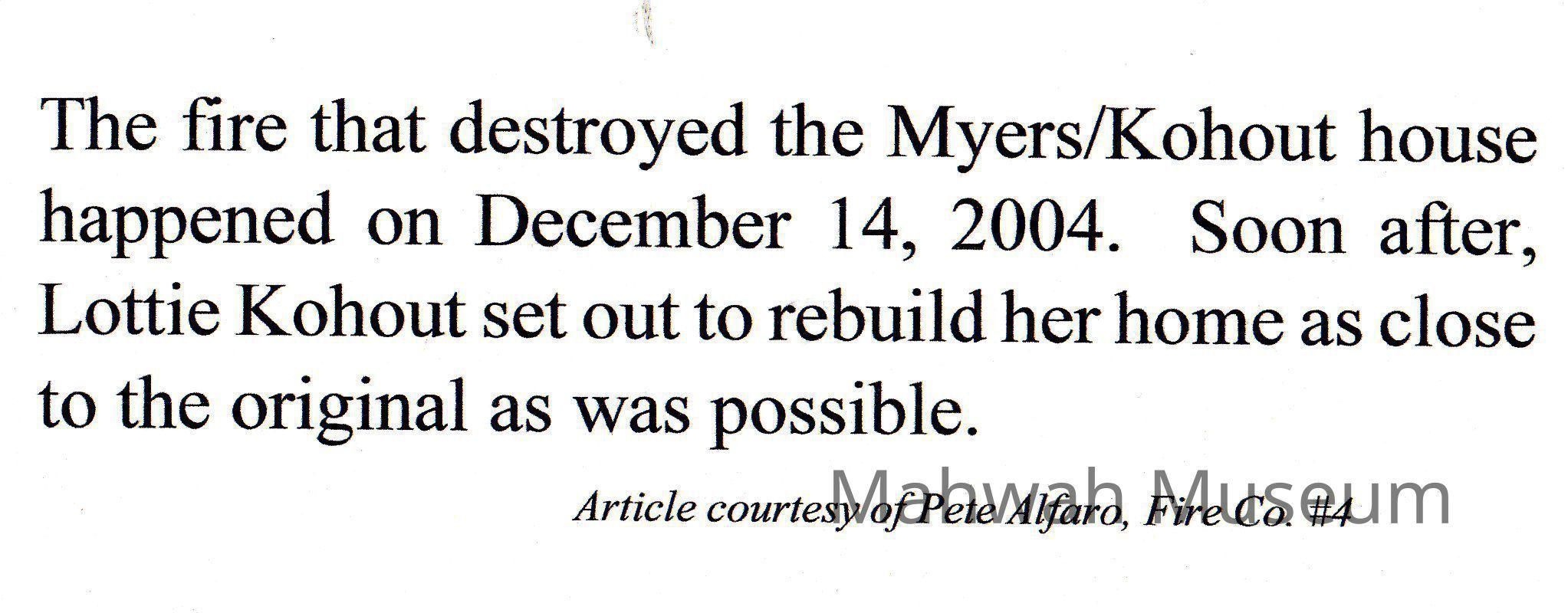 Fire in the Myers/Kohout house article. Caption in exhibit is 2013.09.07.286A. From Neighborhoods of Mahwah Exhibit Panel 2013.09.07.209.Photograph Details