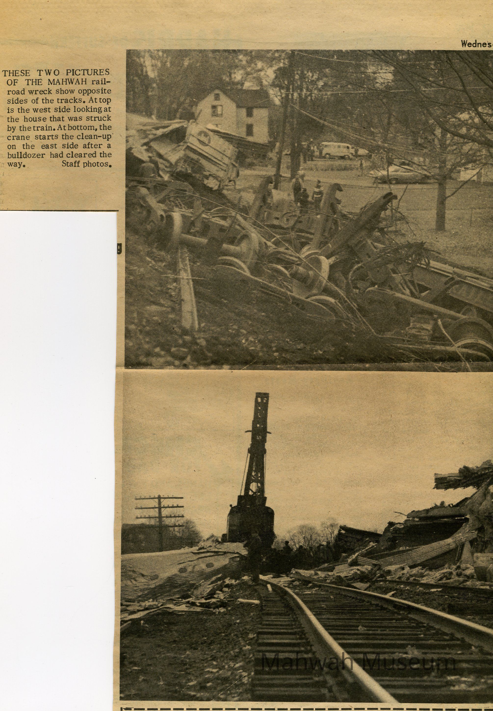 Files consists of 3 newspaper articles from Nov 25th 1970, on Erie Lackawanna freight train derailment in Mahwah which occured on Nov 16th, 1970. Derailment blocked all four tracks. Train struck a house on North Railroad Avenue in Mahwah. Only newspaper photos. No originals.Photograph Details