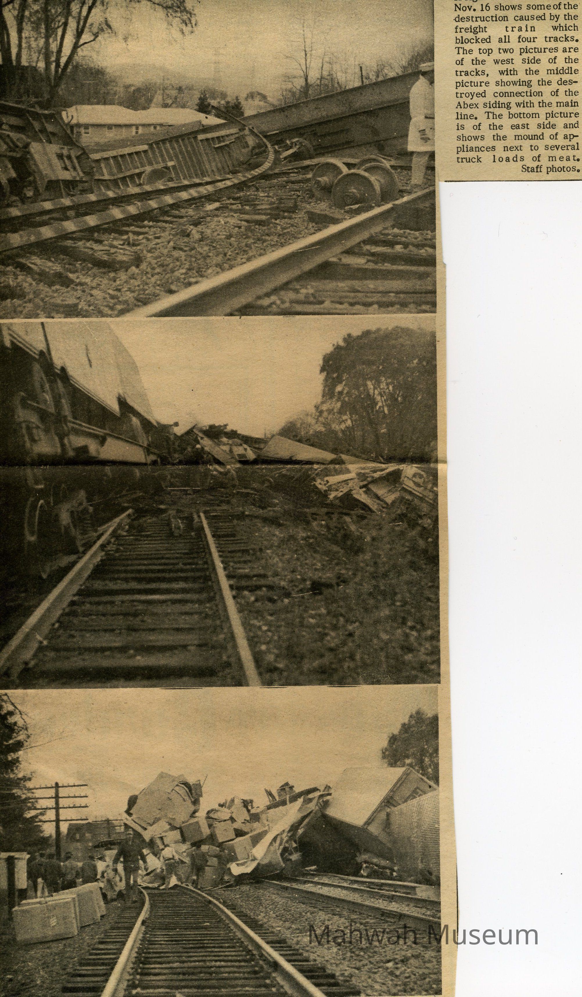 Files consists of 3 newspaper articles from Nov 25th 1970, on Erie Lackawanna freight train derailment in Mahwah which occured on Nov 16th, 1970. Derailment blocked all four tracks. Train struck a house on North Railroad Avenue in Mahwah. Only newspaper photos. No originals.Photograph Details