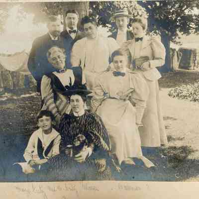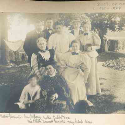 Photograph of a group of Havemeyers and friends, including top row: Baron Leonardi, the Austro-Hungarian Consul, Perry Tiffany, husband of Marie Havemeyer, Emily DeLoosey Havemeyer, Frederick Christian Havemeyer, Theodore Havemeyer Winslow; seated in center, Mrs Fritz and Baroness Leonardi; on ground, Hugh Fritsch and Marie Havemeyer Tiffany.Photograph Details