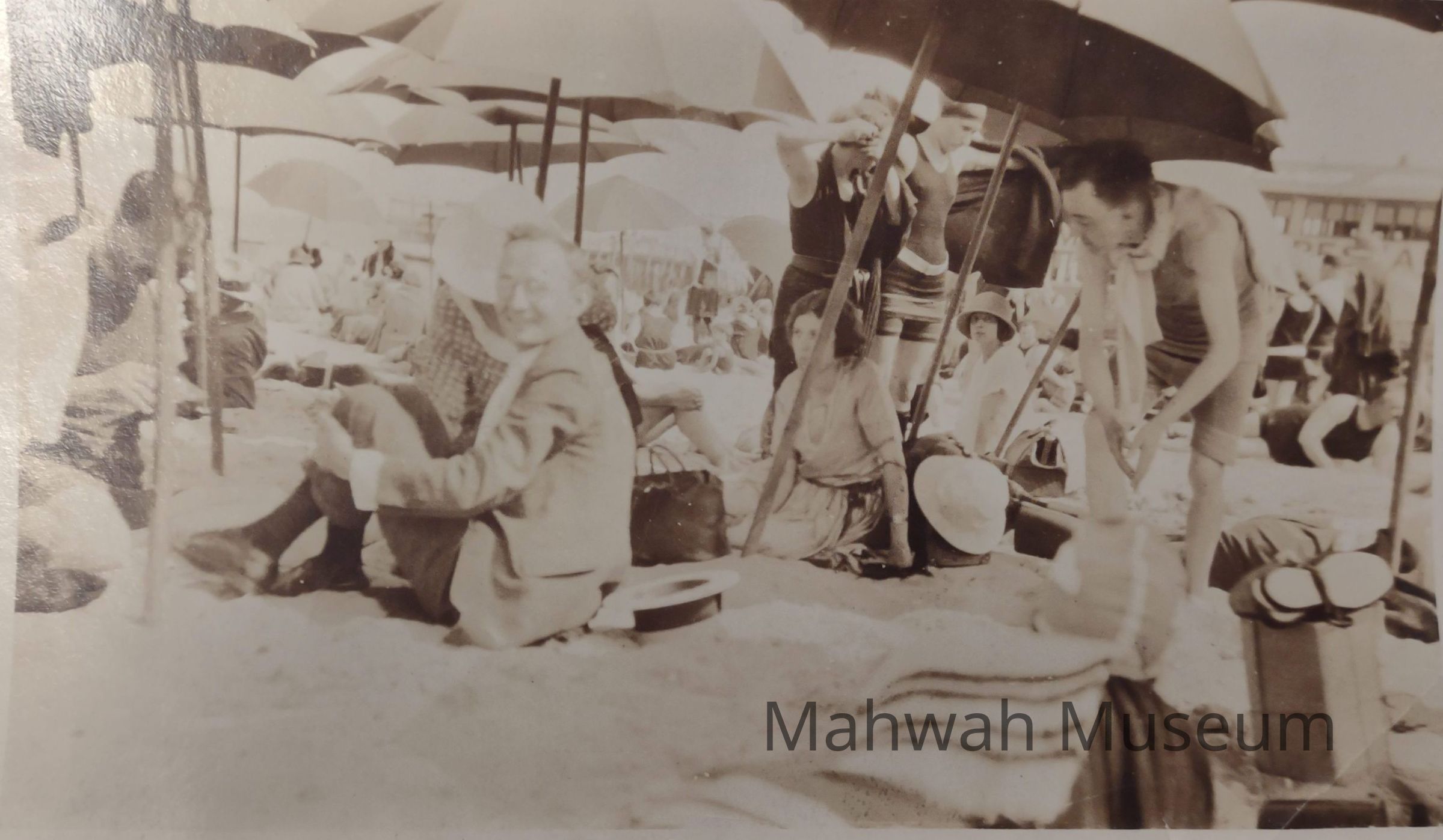 Photo of a company picnic at a beach or lake shore with umbrellas.Photograph Details