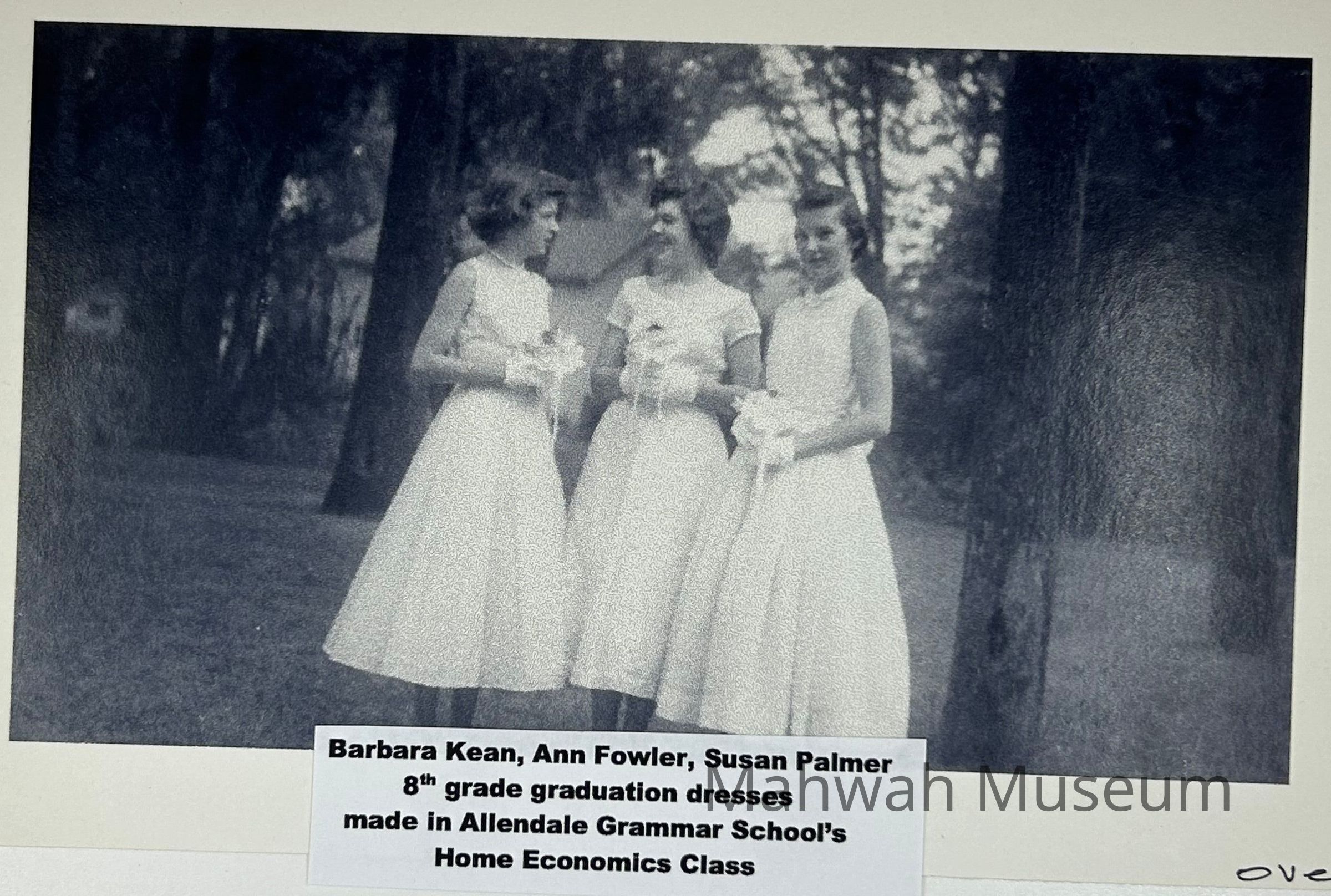 Students from the MHS Class of 1961, wearing 8th grade graduation dresses made in Allendale Grammar School's Home Economics Class. From left to right: Barbara Kean, Ann Fowler, Susan Palmer