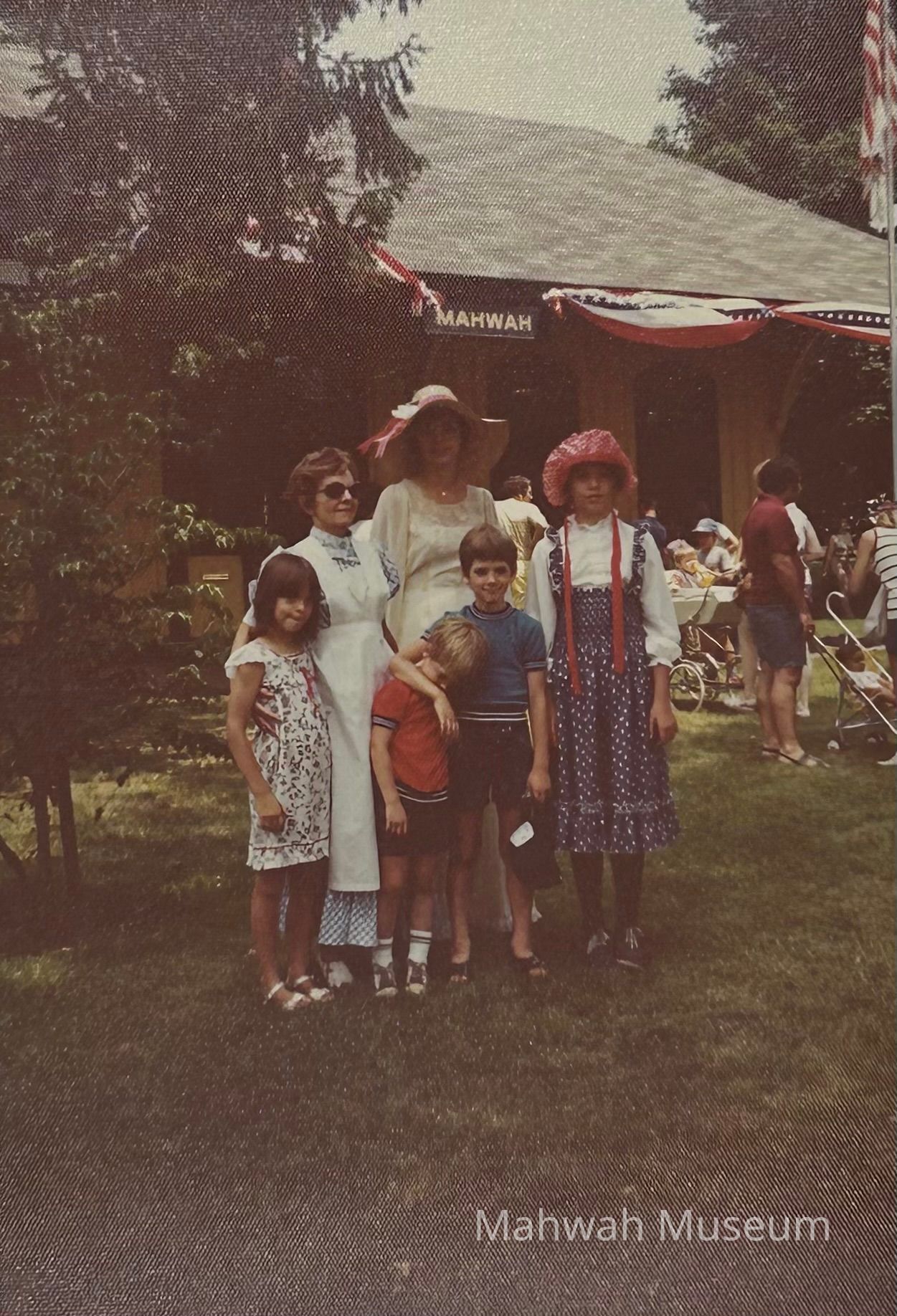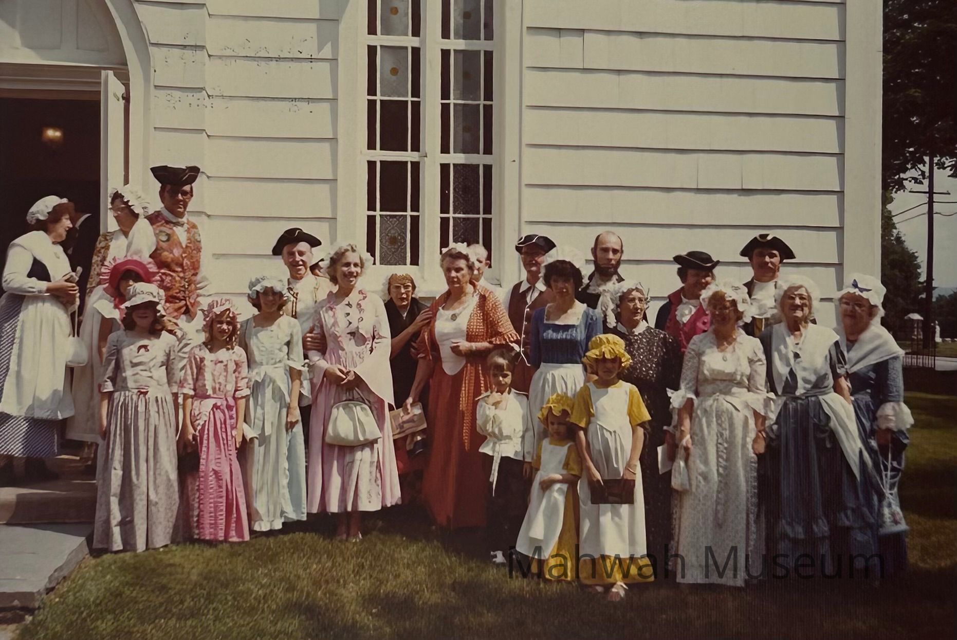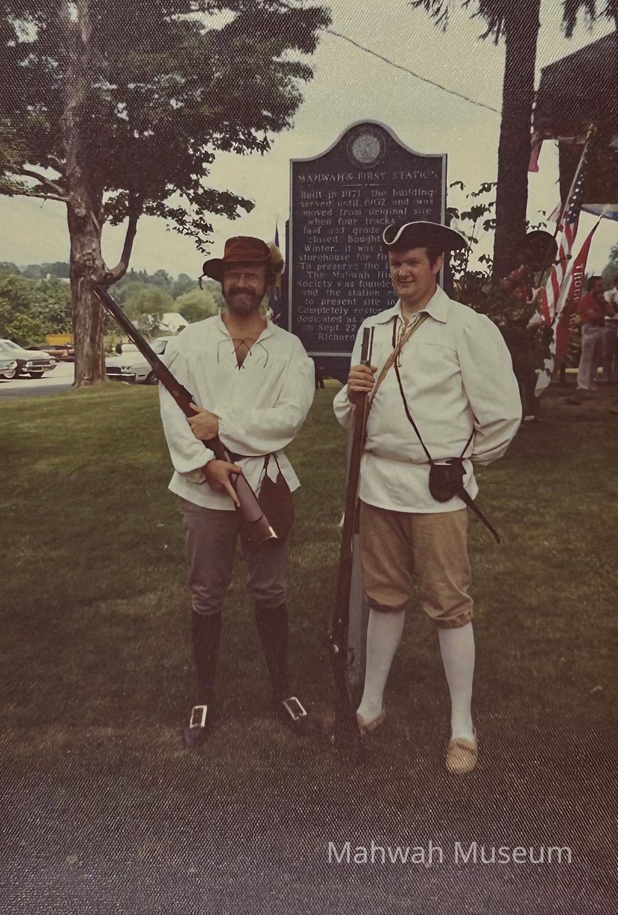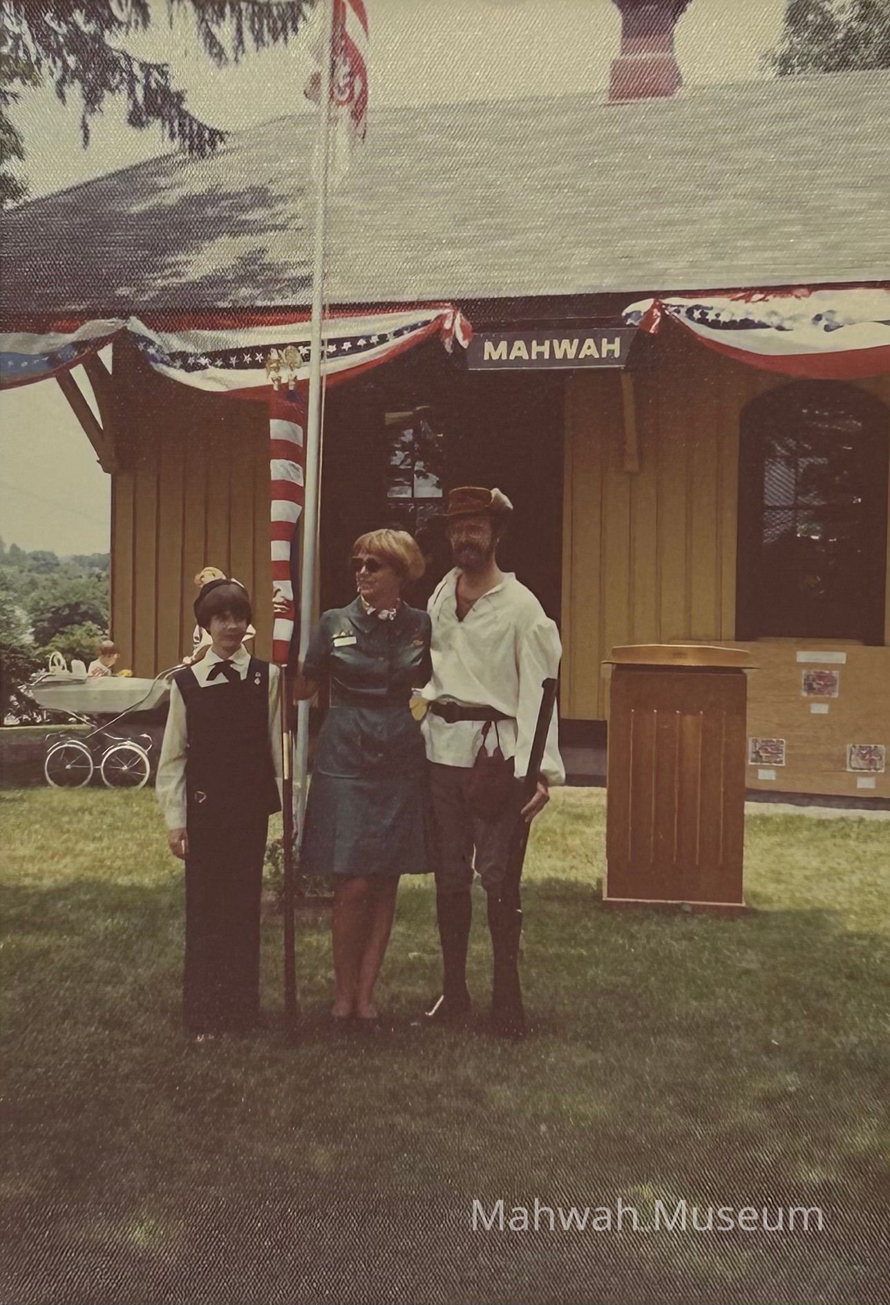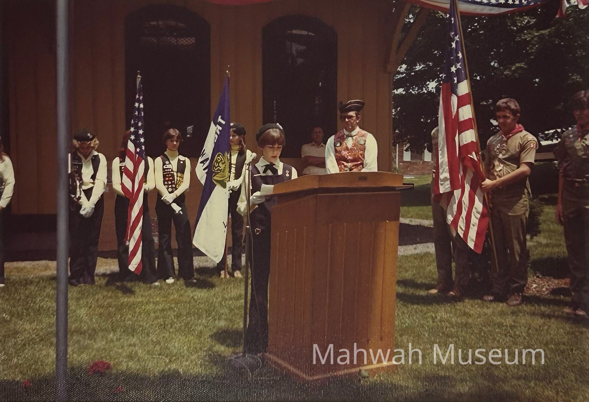 Photos taken during the 1976 Bicentennial event at the Old Station Museum. People wear colonial costume, there are Girl and Boy Scouts. .