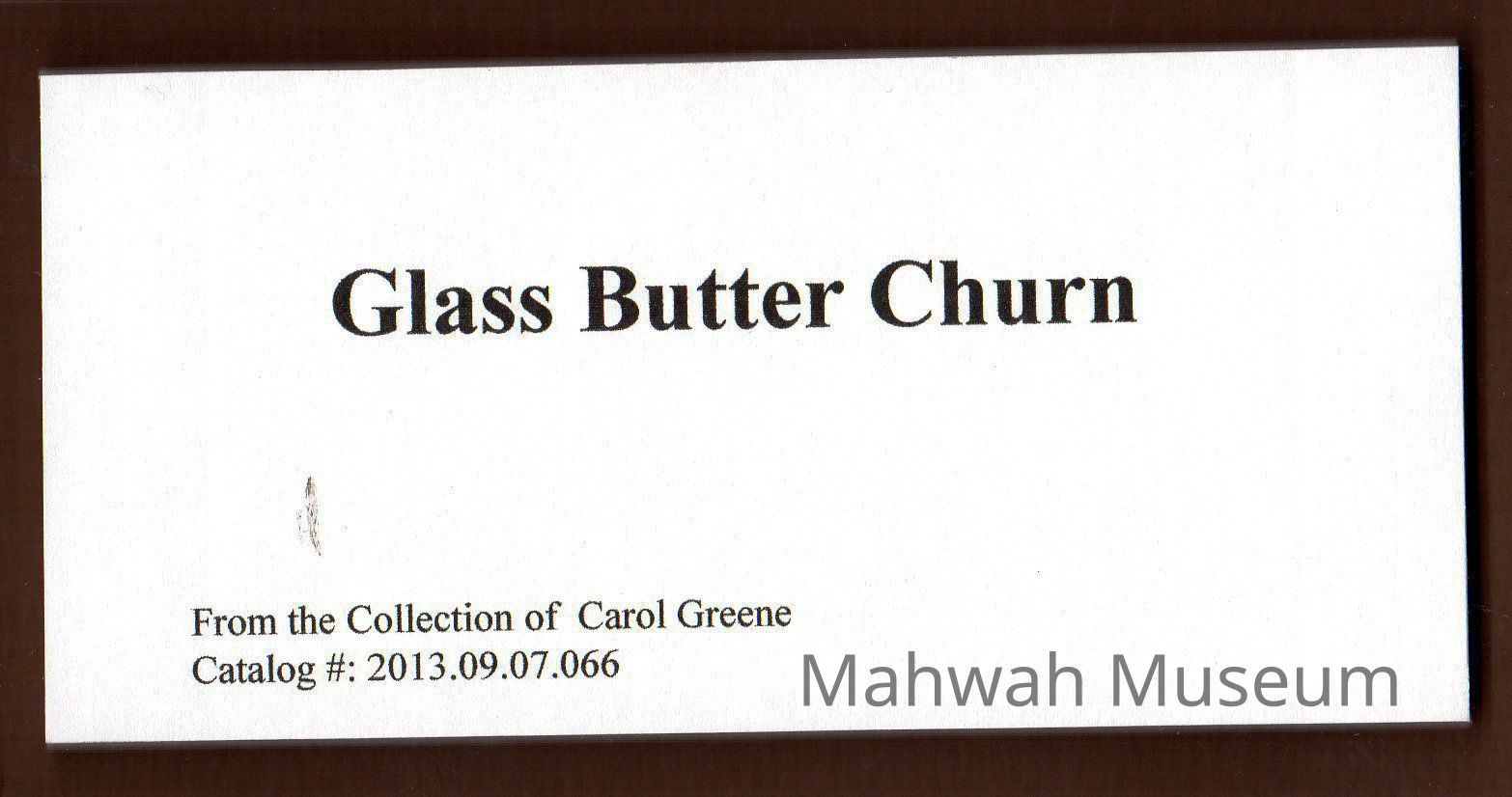 Butter Churn from the Bartholf-Van Voorhis Farm. Contains captions Butter Churn, Glass Butter Churn, and Raw Egg Crate.Collection