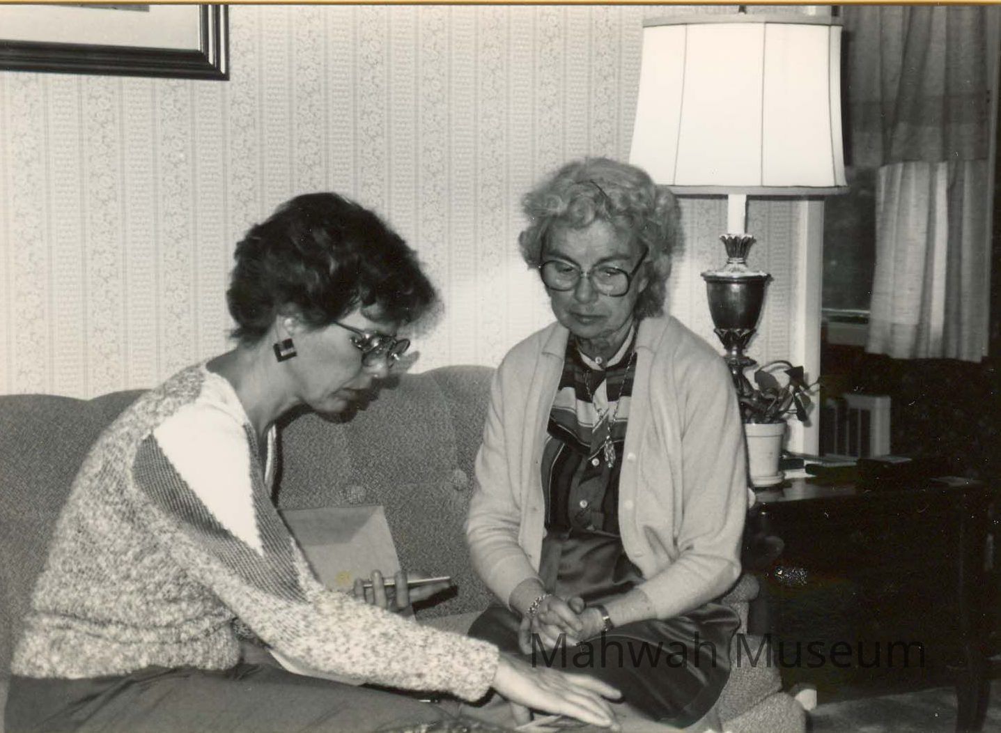 Photos of Isabel Hudson presenting her collection to Carol Greene, member of the Mahwah Preservation Commission. Personal collection of letters, photos, and other documents of Isabel Hudson.