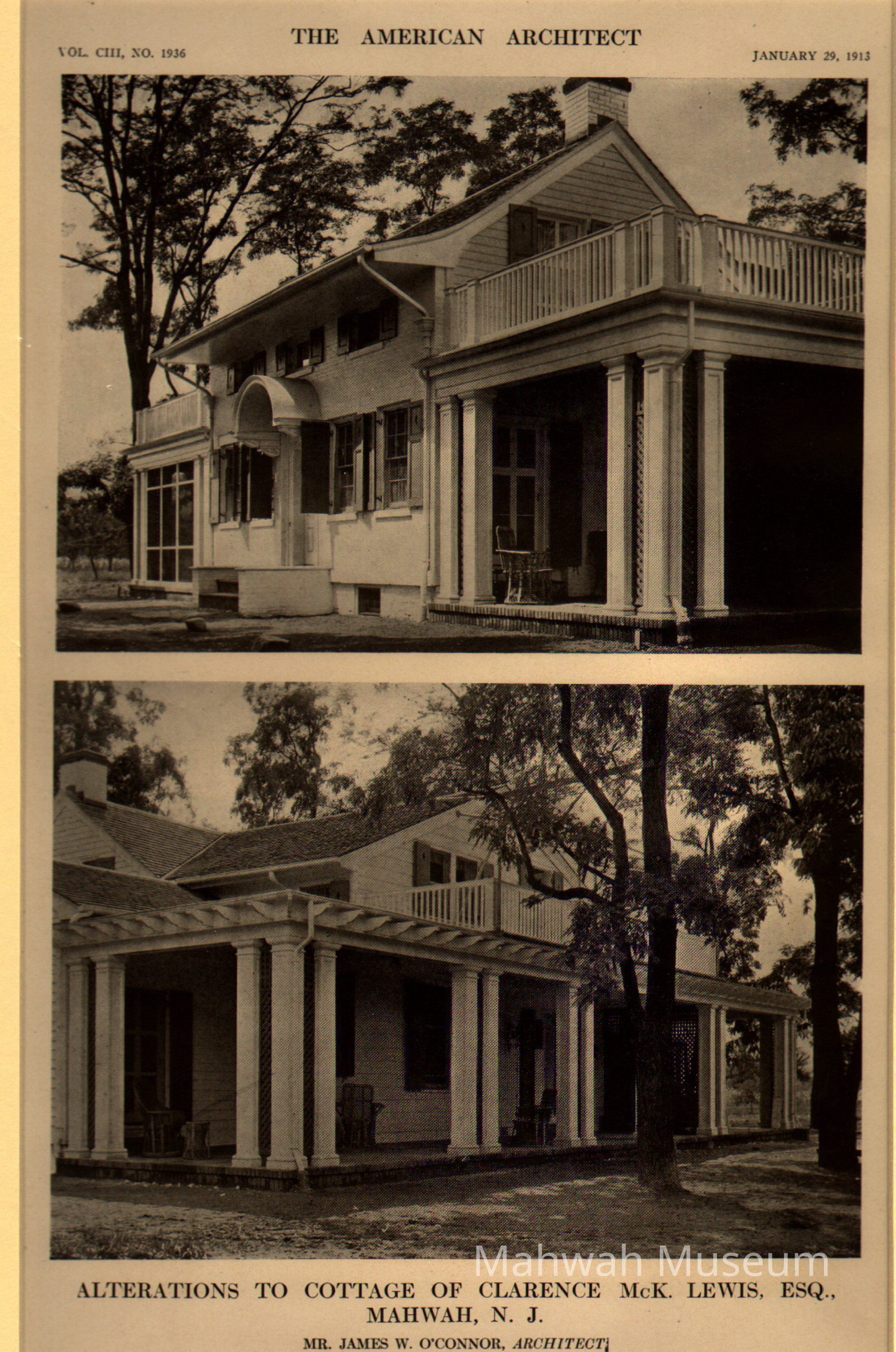 Copy of two black and white photographs of alterations made to the cottage of Clarence McK. Lewsi, Esq. by architect James W. O'Connor. Featured in "The American Architect" Vol. CIII, No. 1936, January 29, 1913. Photogravure. Wrapped in plastic wrap. Mounted on cream-colored photograph mat. Item purchased by Mr. Thomas Dunn from G.R. Goodman Bookseller through eBay.